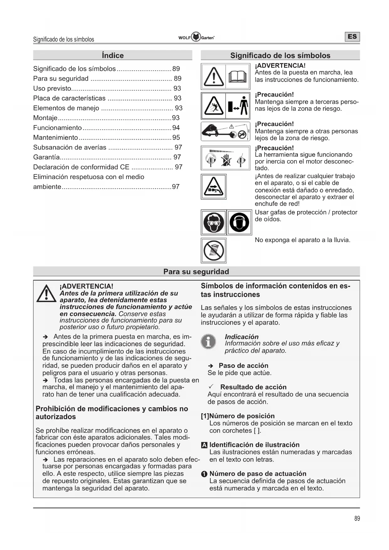 - Eliminación respetuosa con el medio ambiente Para su seguridad 6LJQL¿FDGRGHORVVtPERORV ¡ADVERTENCIA! Antes de la puesta en marcha, lea las instrucciones de funcionamiento. ¡Precaución! Mantenga siempre a terceras perso- nas lejos de la zona de riesgo. 360° ¡Precaución! Mantenga siempre a otras personas lejos de la zona de riesgo. ¡Precaución! La herramienta sigue funcionando por inercia con el motor desconec- tado. ¡Antes de realizar cualquier trabajo en el aparato, o si el cable de conexión está dañado o enredado, desconectar el aparato y extraer el enchufe de red! Usar gafas de protección / protector de oídos. No exponga el aparato a la lluvia. ÍndicePara su seguridad p. 97