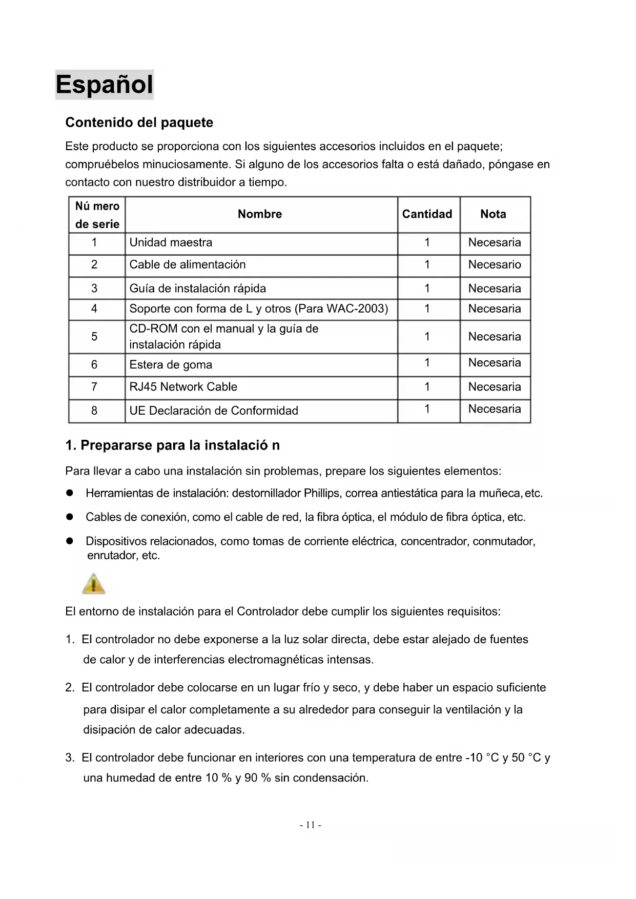 Para llevar a cabo una instalación sin problemas, prepare los siguientes elementos: l Herramientas de instalación: destornillador Phillips, correa antiestática para la muñeca, etc. l Cables de conexión, como el cable de red, la fibra óptica, el módulo de fibra óptica, etc. l Dispositivos relacionados, como tomas de corriente eléctrica, concentrador, conmutador, enrutador, etc. El entorno de instalación para el Controlador debe cumplir los siguientes requisitos: