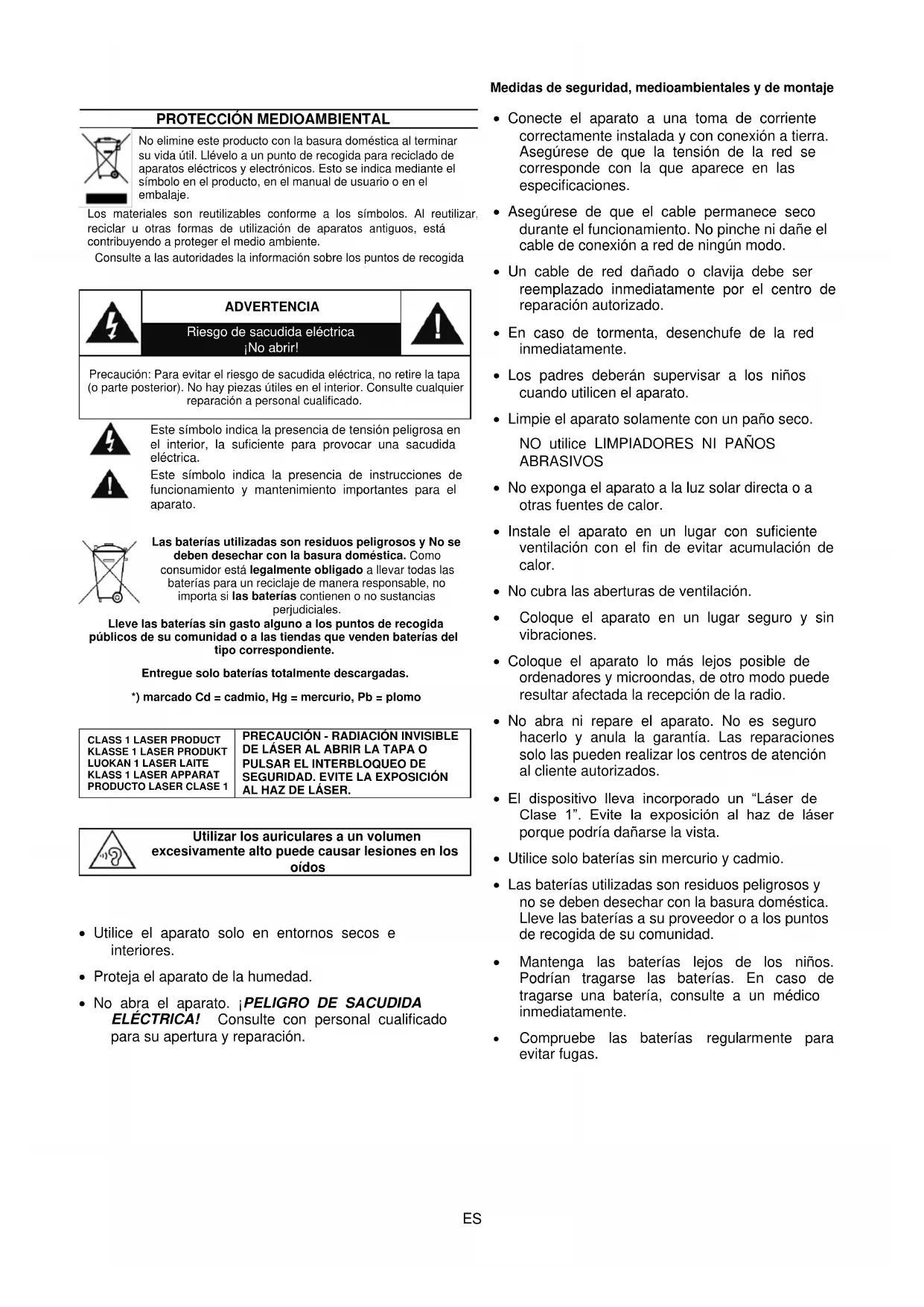Utilice el aparato solo en entornos secos e interiores. Proteja el aparato de la humedad. No abra el aparato. ¡PELIGRO DE SACUDIDA ELÉCTRICA! Consulte con personal cualificado para su apertura y reparación. Conecte el aparato a una toma de corriente correctamente instalada y con conexión a tierra. Asegúrese de que la tensión de la red se corresponde con la que aparece en las especificaciones. Asegúrese de que el cable permanece seco durante el funcionamiento. No pinche ni dañe el cable de conexión a red de ningún modo. Un cable de red dañado o clavija debe ser reemplazado inmediatamente por el centro de reparación autorizado. En caso de tormenta, desenchufe de la red inmediatamente. Los padres deberán supervisar a los niños cuando utilicen el aparato. Limpie el aparato solamente con un paño seco. NO utilice LIMPIADORES NI PAÑOS ABRASIVOS No exponga el aparato a la luz solar directa o a otras fuentes de calor. Instale el aparato en un lugar con suficiente ventilación con el fin de evitar acumulación de calor. No cubra las aberturas de ventilación. Coloque el aparato en un lugar seguro y sin vibraciones. Coloque el aparato lo más lejos posible de ordenadores y microondas, de otro modo puede resultar afectada la recepción de la radio. No abra ni repare el aparato. No es seguro hacerlo y anula la garantía. Las reparaciones solo las pueden realizar los centros de atención al cliente autorizados. El dispositivo lleva incorporado un “Láser de Clase 1”. Evite la exposición al haz de láser porque podría dañarse la vista. Utilice solo baterías sin mercurio y cadmio. Las baterías utilizadas son residuos peligrosos y no se deben desechar con la basura doméstica. Lleve las baterías a su proveedor o a los puntos de recogida de su comunidad. Mantenga las baterías lejos de los niños. Podrían tragarse las baterías. En caso de tragarse una batería, consulte a un médico inmediatamente. Compruebe las baterías regularmente para evitar fugas.SCD1900 / Español Manual de instrucciones