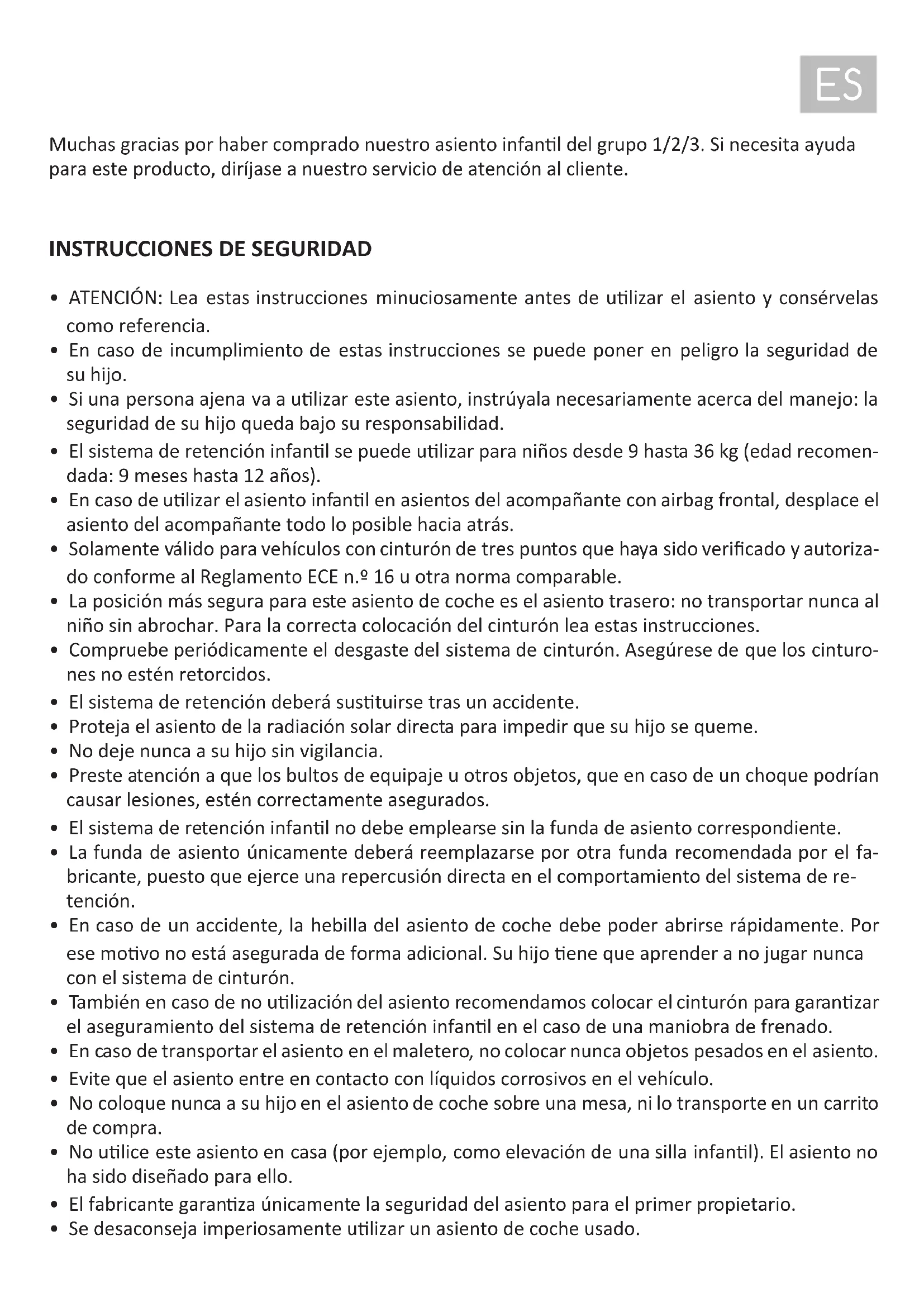 - El fabricante garanza únicamente la seguridad del asiento para el primer propietario.