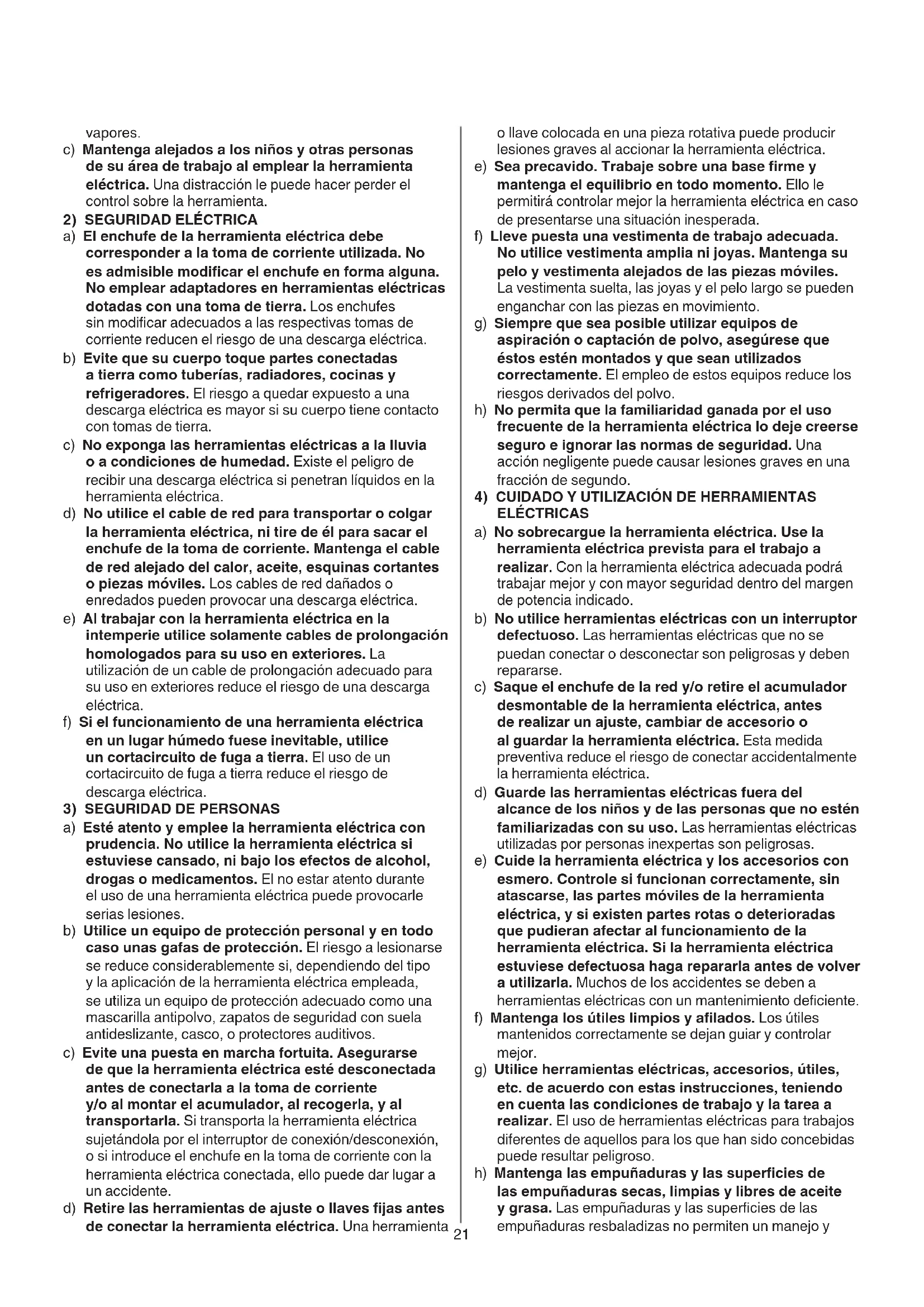 g) Utilice herramrientas electricas, accesorios, utiles, etc. de acuerdo con estas instrucciones, teniendo en cuenta las conditiones de trabajo y laarea a realizar. El uso de herramrientas electricas para problemas differentes de aquellos para los que han sido concebidas pueda resultar peligioso.