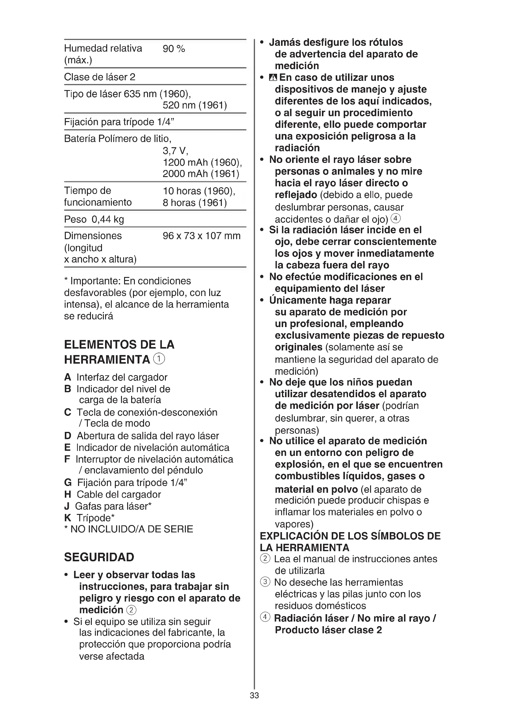 Radiación láser / No mire al rayo / Producto láser clase 2 Humedad relativa (máx.) 90 % Clase de láser 2 Tipo de láser 635 nm (1960), 520 nm (1961) Fijación para trípode 1/4” Batería Polímero de litio, 3,7 V, 1200 mAh (1960), 2000 mAh (1961) Tiempo de funcionamiento 10 horas (1960), 8 horas (1961) Peso 0,44 kg Dimensiones (longitud x ancho x altura) 96 x 73 x 107 mm