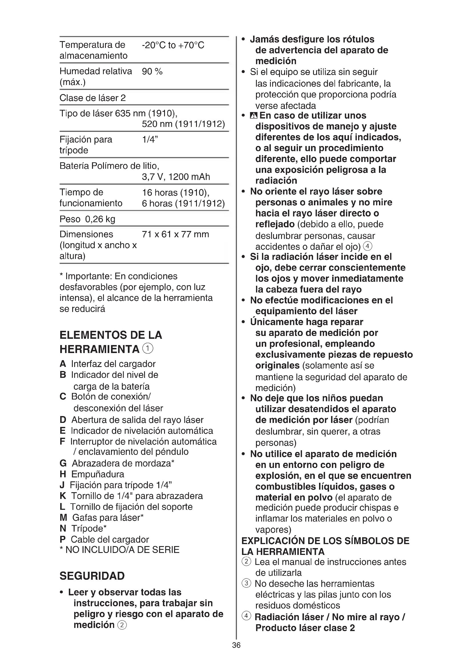 Radiación láser / No mire al rayo / Producto láser clase 2 Temperatura de almacenamiento -20°C to +70°C Humedad relativa (máx.) 90 % Clase de láser 2 Tipo de láser 635 nm (1910), 520 nm (1911/1912) Fijación para trípode 1/4” Batería Polímero de litio, 3,7 V, 1200 mAh Tiempo de funcionamiento 16 horas (1910), 6 horas (1911/1912) Peso 0,26 kg Dimensiones (longitud x ancho x altura) 71 x 61 x 77 mm