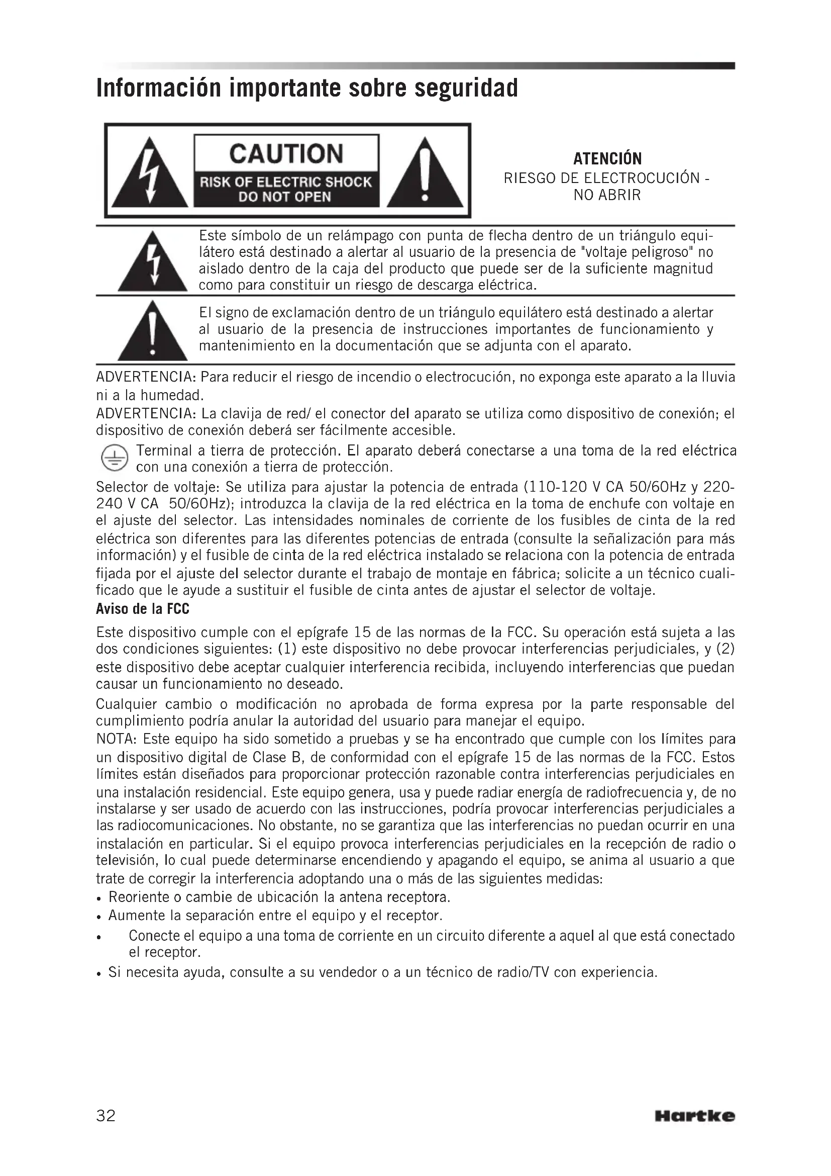 Technische Daten Nennausgangsleistung 600 Watt @ 4 Ohm 450 Watt @ 8 Ohm Frequenzbereich 10 Hz - 40 kHz -1 dB Vorverstärker-Rohr Geringes Geräusch 12 AX7 A High-Mu-Doppeltriode Aktiver Eingang >1 MΩ unausgeglichen, -10 dBV, -8 dBu Passiver Eingang >1 MΩ unausgeglichen, -20 dBV, -18 dBu Kompressionsverhältnis festgelegt 2,1 Kompressionsgrenzwert Aus bis -30 dBu Passiver Eingang, Aus bis -20 dBu Aktiver Eingang Stumm >80 dB (normalerweise 100 dB) bei Direktem Ausgang & Lautsprecherausgang Brite-Schalter 10 kH, +8 dB Verstärkung @ 2 Uhr; +5 dB Verstärkung @ min Tone-Stack-EQ Bass +8/-14 dB, 80 Hz entsprechend 12 Uhr Form +11/-3 dB entsprechend 12 Uhr Frequenz 200 Hz bis 800 Hz Höhen +5/-20 dB, 6 kHz entsprechend 12 Uhr Vorverstärker-Ausgang 100 Ω unausgeglichen 0 dBu Endstufe Eingang 20 kΩ ausgeglichen, 0 dBu für Nennausgangsleistung (+14 dBu max. Eingang) Direkter Ausgang 125 Ω unausgeglichen Stereo Aux-Eingang 3 kΩ unausgeglichen, 10 dBV Telefone max. 80 mW, schaltet Direkten Ausgang und Lautsprecherausgang aus Abmessungen 14” x 10,6” x 2,6” / 355 mm x 270 mm x 66 mm Gewicht 7lb / 3,2 kg Wir bei Hartke arbeiten daran, unsere Produkten kontinuierlich zu verbessern, deshalb können Spezifikationen und Abbildungen ohne Vorankündigung geändert werden.32 Información importante sobre seguridad ADVERTENCIA: Para reducir el riesgo de incendio o electrocución, no exponga este aparato a la lluvia ni a la humedad. ADVERTENCIA: La clavija de red/ el conector del aparato se utiliza como dispositivo de conexión; el dispositivo de conexión deberá ser fácilmente accesible. Terminal a tierra de protección. El aparato deberá conectarse a una toma de la red eléctrica con una conexión a tierra de protección. Selector de voltaje: Se utiliza para ajustar la potencia de entrada (110-120 V CA 50/60Hz y 220- 240 V CA 50/60Hz); introduzca la clavija de la red eléctrica en la toma de enchufe con voltaje en el ajuste del selector. Las intensidades nominales de corriente de los fusibles de cinta de la red eléctrica son diferentes para las diferentes potencias de entrada (consulte la señalización para más información) y el fusible de cinta de la red eléctrica instalado se relaciona con la potencia de entrada fijada por el ajuste del selector durante el trabajo de montaje en fábrica; solicite a un técnico cuali- ficado que le ayude a sustituir el fusible de cinta antes de ajustar el selector de voltaje. Aviso de la FCC Este dispositivo cumple con el epígrafe 15 de las normas de la FCC. Su operación está sujeta a las dos condiciones siguientes: (1) este dispositivo no debe provocar interferencias perjudiciales, y (2) este dispositivo debe aceptar cualquier interferencia recibida, incluyendo interferencias que puedan causar un funcionamiento no deseado. Cualquier cambio o modificación no aprobada de forma expresa por la parte responsable del cumplimiento podría anular la autoridad del usuario para manejar el equipo. NOTA: Este equipo ha sido sometido a pruebas y se ha encontrado que cumple con los límites para un dispositivo digital de Clase B, de conformidad con el epígrafe 15 de las normas de la FCC. Estos límites están diseñados para proporcionar protección razonable contra interferencias perjudiciales en una instalación residencial. Este equipo genera, usa y puede radiar energía de radiofrecuencia y, de no instalarse y ser usado de acuerdo con las instrucciones, podría provocar interferencias perjudiciales a las radiocomunicaciones. No obstante, no se garantiza que las interferencias no puedan ocurrir en una instalación en particular. Si el equipo provoca interferencias perjudiciales en la recepción de radio o televisión, lo cual puede determinarse encendiendo y apagando el equipo, se anima al usuario a que trate de corregir la interferencia adoptando una o más de las siguientes medidas: