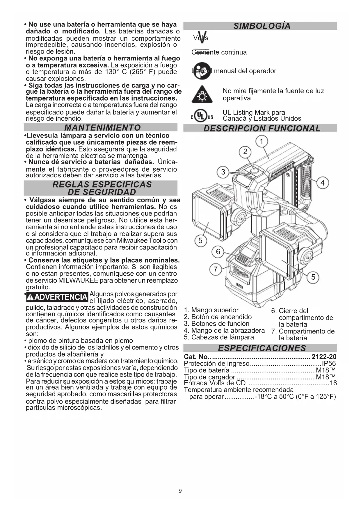 colocar el cierre con rmeza. OPERACION ATENCIÓN Para reducir el riesgo de lesiones, no mire jamente la fuente de luz operativa. Para encender la luz, presione el botón de Encen- dido . Presione los botones de MODE (FUNCIÓN) para cambiar de entre los tres ajustes de cada luz. Gire las cabezas al ángulo deseado. Para apagar la luz, presione de nuevo el botón de Encendido . NOTA: La lámpara usará de manera predeterminada la intensidad seleccionada la siguiente vez que se encienda. Para usar la abrazadera del mango, sujete el mango superior y jale el mango de la abrazadera. MANTENIMIENTO ADVERTENCIA Para reducir el riesgo de una lesión, desconecte siempre la herramienta antes de darle cualquier manten- imiento. Nunca desarme la herramienta ni trate de hacer modicaciones en el sistema eléctrico de la misma. Acuda siempre a un Centro de Servicio MILWAUKEE para TODAS las reparacio- nes. Mantenimiento de la lámpara Mantenga su lámpara, batería y cargador en bue- nas condiciones adoptando un programa periódico de mantenimiento. Si la lámpara no funciona cor- rectamente, devuélvala a un centro de servicio MILWAUKEE para reparación. ADVERTENCIA Para reducir el riesgo de una explosión, no queme nunca una batería, aun si está dañada, “muerta” o completamente descargada. Limpieza Limpie el polvo y suciedad de las cualquier ventilas. Mantenga los herramienta, limpios, secos y libres de aceite o grasa. Use solo jabón neutro y un trapo húmedo para limpiar, ya que algunos substancias y solventes limpiadores son dañinos a los plásticos y partes aislantes. Algunos de estos incluyen: gasolina, turpentina,thíner, lacas, thíner para pinturas, solven- tes para limpieza con cloro, amoníaco y detergentes caseros que tengan amonia. Nunca usa solventes in- amables o combustibles cerca de una herramienta. ACCESORIOS ADVERTENCIA Utilice sólo los accesorios especícamente recomenda- dos. Otros accesorios puede ser peligroso. Para una lista completa de accessorios, visite nuestro sitio en Internet: www.milwaukeetool.com o póngase en contacto con un distribuidor. SOPORTE DE