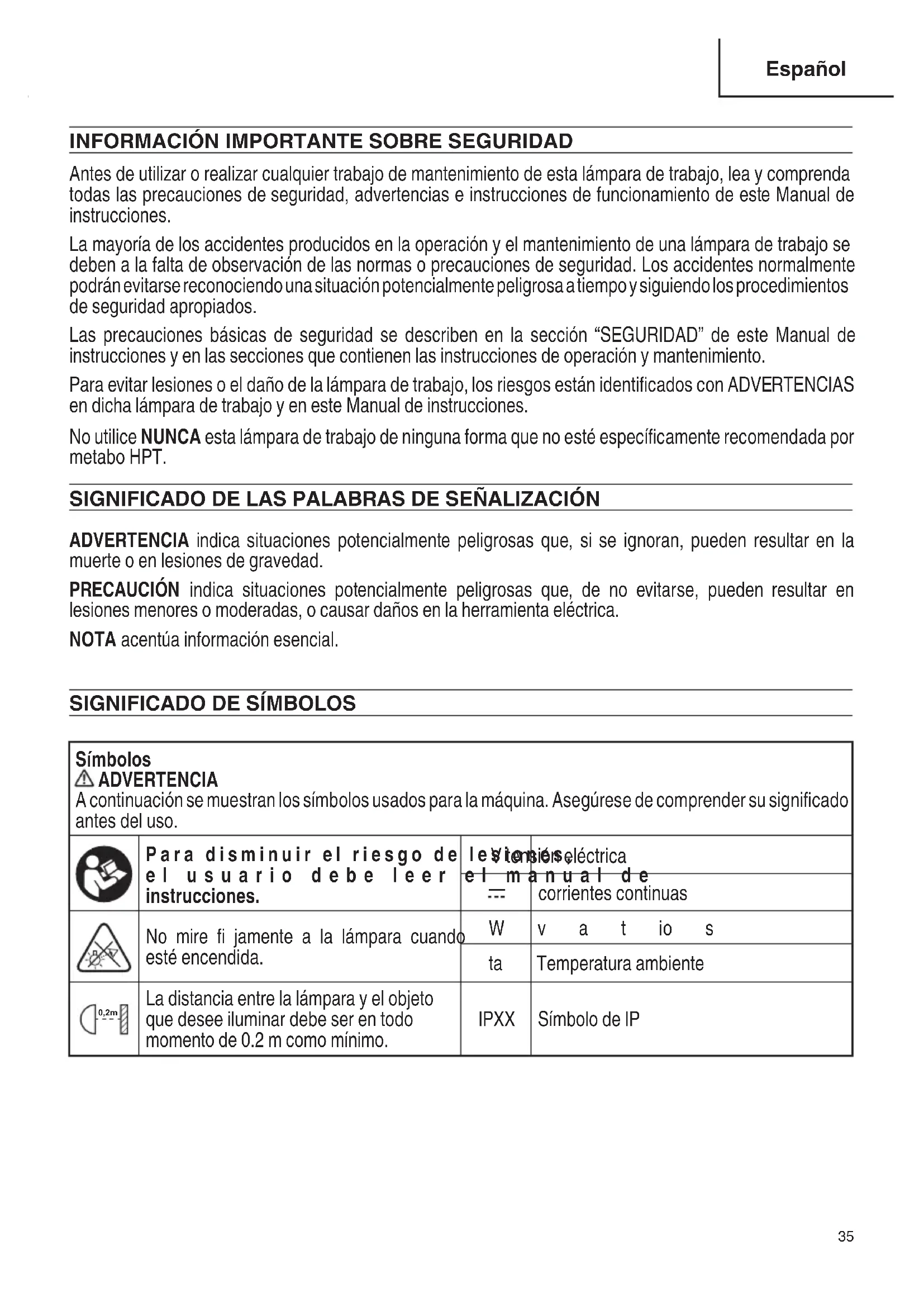 Français 00BookUB18DBNA.indb3400BookUB18DBNA.indb34 2021/10/0616:38:532021/10/0616:38:53INFORMACIÓN IMPORTANTE SOBRE SEGURIDAD Antes de utilizar o realizar cualquier trabajo de mantenimiento de esta lámpara de trabajo, lea y comprenda todas las precauciones de seguridad, advertencias e instrucciones de funcionamiento de este Manual de instrucciones. La mayoría de los accidentes producidos en la operación y el mantenimiento de una lámpara de trabajo se deben a la falta de observación de las normas o precauciones de seguridad. Los accidentes normalmente podrán evitarse reconociendo una situación potencialmente peligrosa a tiempo y siguiendo los procedimientos de seguridad apropiados. Las precauciones básicas de seguridad se describen en la sección “SEGURIDAD” de este Manual de instrucciones y en las secciones que contienen las instrucciones de operación y mantenimiento. Para evitar lesiones o el daño de la lámpara de trabajo, los riesgos están identifi cados con ADVERTENCIAS en dicha lámpara de trabajo y en este Manual de instrucciones. No utilice NUNCA esta lámpara de trabajo de ninguna forma que no esté específi camente recomendada por metabo HPT. SIGNIFICADO DE LAS PALABRAS DE SEÑALIZACIÓN ADVERTENCIA indica situaciones potencialmente peligrosas que, si se ignoran, pueden resultar en la muerte o en lesiones de gravedad. PRECAUCIÓN indica situaciones potencialmente peligrosas que, de no evitarse, pueden resultar en lesiones menores o moderadas, o causar daños en la herramienta eléctrica. NOTA acentúa información esencial.