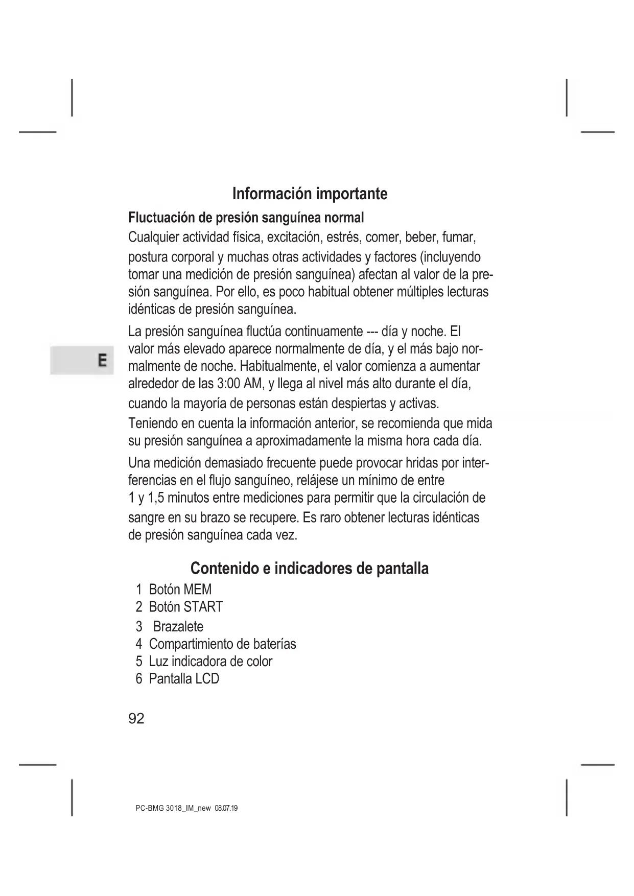 a. Abra la tapa de baterías en la parte posterior del monitor. b. Inserte 2 baterías del tipo „AAA“. Tenga en cuenta la polaridad. c. Cierre la tapa de baterías. Cuando el LCD muestre el símbolo de batería , cambie todas las baterías por otras nuevas. Las baterías recargables no son adecuadas para este monitor. Saque las baterías si no va a usar el monitor durante un mes o más para evitar daños por fugas de las baterías. No deje que el líquido de las baterías entre en los ojos. Si se introduce en los ojos, enjuáguelos de inmediato con mucho agua limpia y contacte con un médico.101 PC-BMG 3018_IM_new 08.07.19 El monitor, las baterías y el brazalete deben desecharse de acuerdo con las normativas locales al nalizar su vida útil.