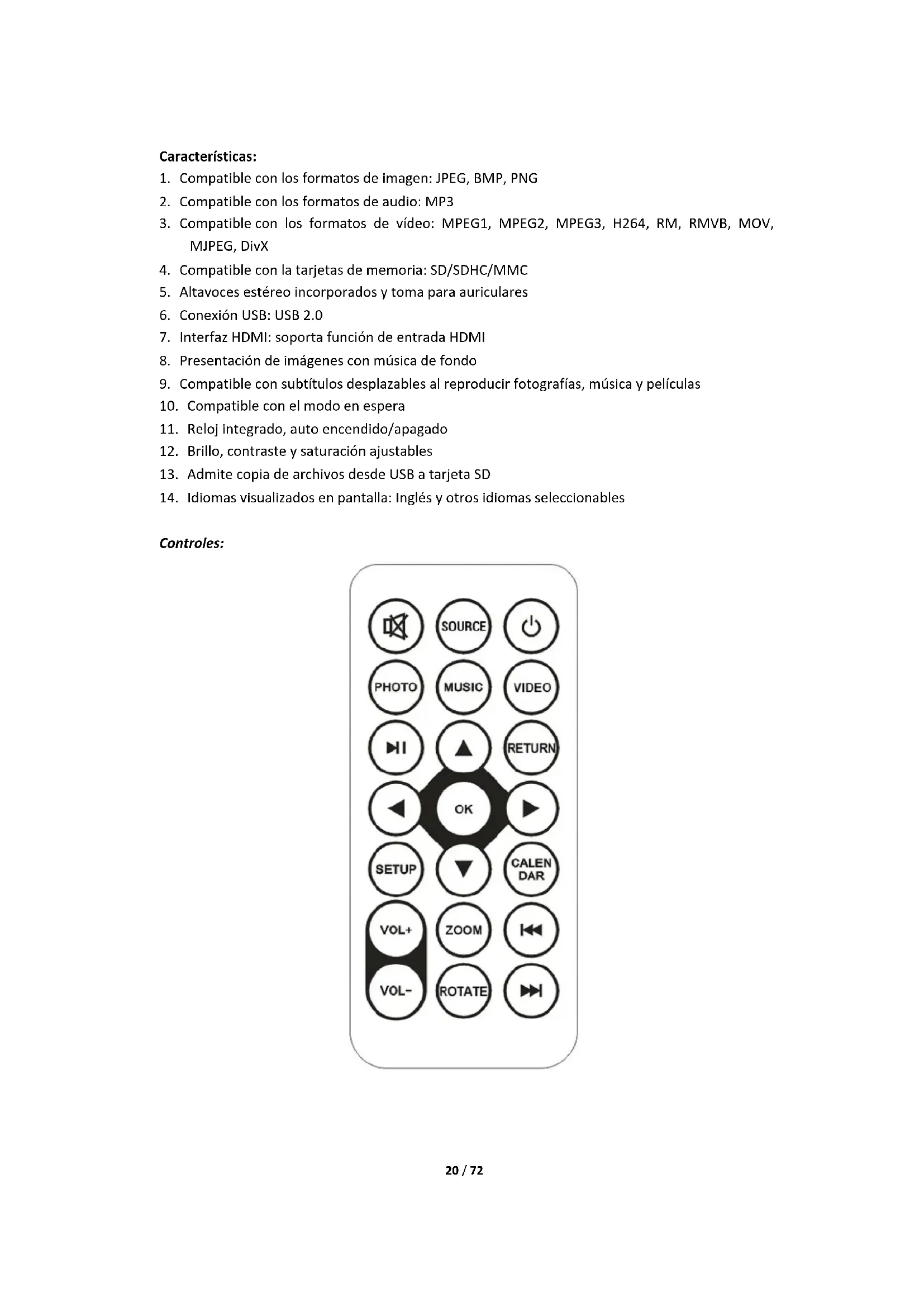 Reproducir/Pausa RETURN Volver a la pantalla anterior Teclas de cursor arriba/abajo/izquierda/derecha. OK Confirmación SETUP Menú de configuración CALENDAR Directamente a la función calendario VOL+ VOL- Ajuste de volumen ZOOM Agrandar la fotografía en el modo de reproducción de fotografía ROTATE Girar la fotografía en el modo de reproducción de fotografía Seleccionar el archivo anterior o el siguiente Menú principal: Compatible con SD/SDHC/MMC y USB 2.0. Presione para acceder a los menús de configuración de fotografía, música, vídeo y calendario. Presione el botón OK para confirmar la selección. Nota: Asegúrese de que en el dispositivo USB hay archivos de imagen, música o vídeo compatibles en la tarjeta de memoria.22 / 72 Modo de Imagen: En el menú principal marque Photo, presione OK para seleccionar el dispositivo USB o la tarjeta de memoria a reproducir y presione RETURN para acceder al modo miniatura. Presione para seleccionar la fotografía a reproducir y OK para confirmar.