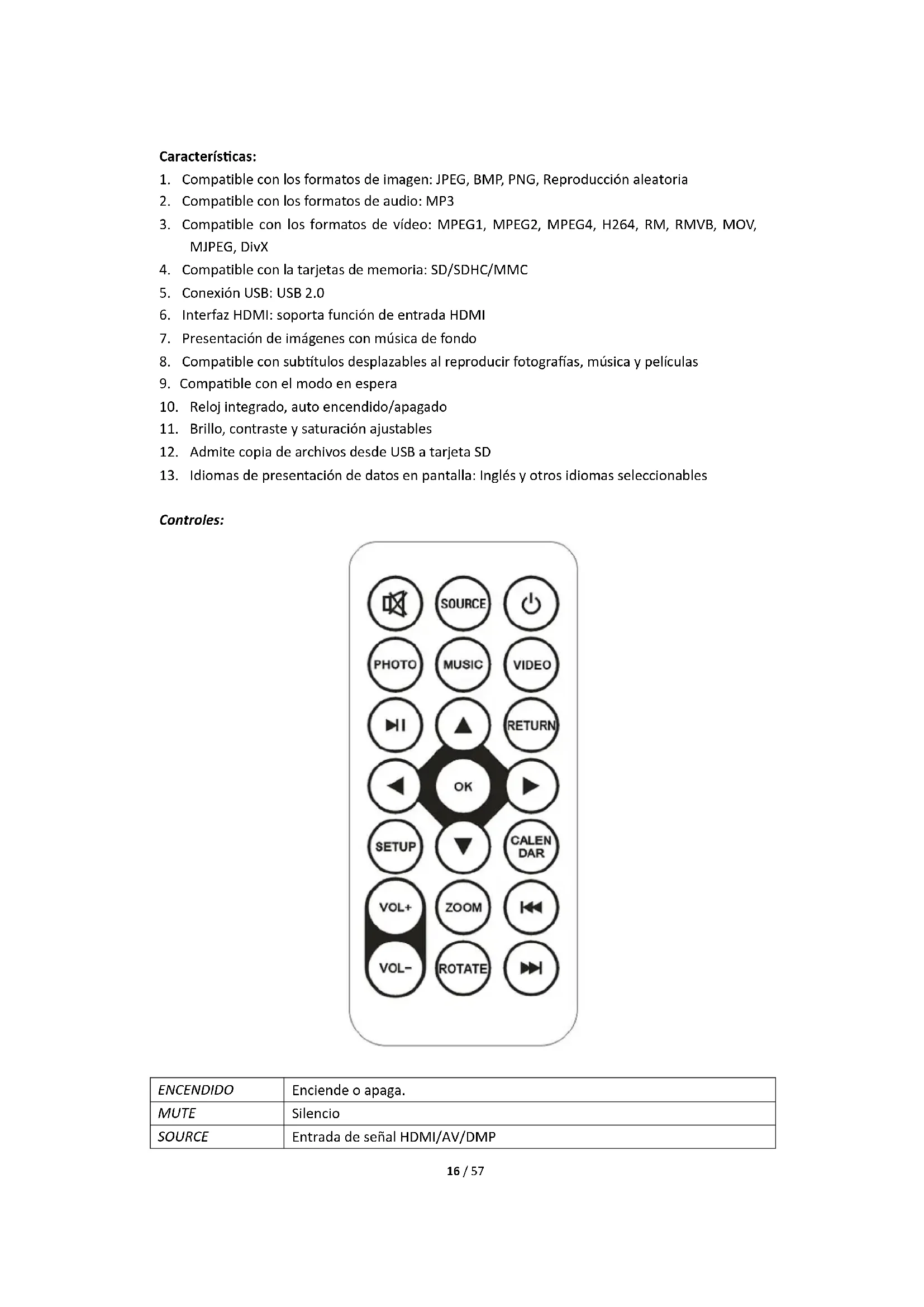 Compatible con SD/SDHC/MMC y USB 2.0. Presione para acceder a los manos de configuracion de fotografia, musica, video y calendario. Presione el boton OK para confirmar la seleccion.