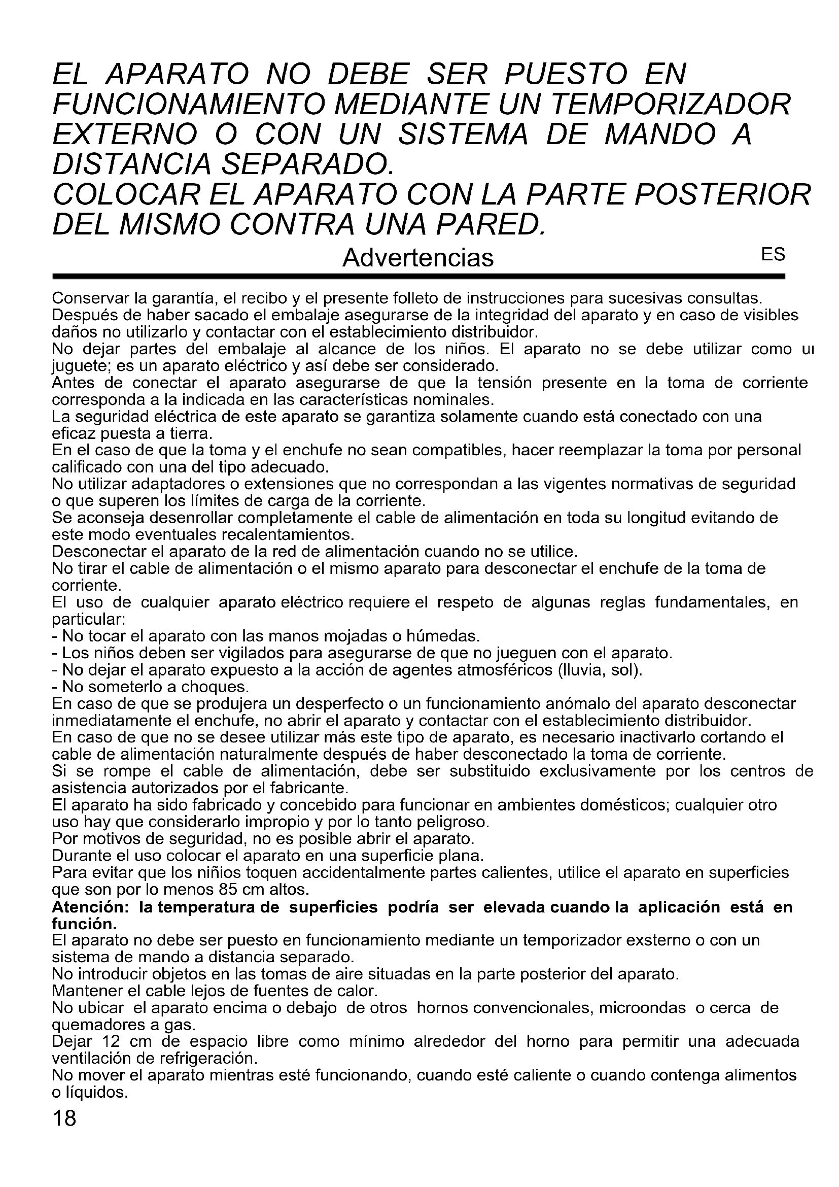 Advertencias Conservar la garantía, el recibo y el presente folleto de instrucciones para sucesivas consultas. Después de haber sacado el embalaje asegurarse de la integridad del aparato y en caso de visibles daños no utilizarlo y contactar con el establecimiento distribuidor. No dejar partes del embalaje al alcance de los niños. El aparato no se debe utilizar como un juguete; es un aparato eléctrico y así debe ser considerado. Antes de conectar el aparato asegurarse de que la tensión presente en la toma de corriente corresponda a la indicada en las características nominales. La seguridad eléctrica de este aparato se garantiza solamente cuando está conectado con una ecaz puesta a tierra. En el caso de que la toma y el enchufe no sean compatibles, hacer reemplazar la toma por personal calicado con una del tipo adecuado. No utilizar adaptadores o extensiones que no correspondan a las vigentes normativas de seguridad o que superen los límites de carga de la corriente. Se aconseja desenrollar completamente el cable de alimentación en toda su longitud evitando de este modo eventuales recalentamientos. Desconectar el aparato de la red de alimentación cuando no se utilice. No tirar el cable de alimentación o el mismo aparato para desconectar el enchufe de la toma de corriente. El uso de cualquier aparato eléctrico requiere el respeto de algunas reglas fundamentales, en particular: - No tocar el aparato con las manos mojadas o húmedas. - Los niños deben ser vigilados para asegurarse de que no jueguen con el aparato. - No dejar el aparato expuesto a la acción de agentes atmosféricos (lluvia, sol). - No someterlo a choques. En caso de que se produjera un desperfecto o un funcionamiento anómalo del aparato desconectar inmediatamente el enchufe, no abrir el aparato y contactar con el establecimiento distribuidor. En caso de que no se desee utilizar más este tipo de aparato, es necesario inactivarlo cortando el cable de alimentación naturalmente después de haber desconectado la toma de corriente. Si se rompe el cable de alimentación, debe ser substituido exclusivamente por los centros de asistencia autorizados por el fabricante. El aparato ha sido fabricado y concebido para funcionar en ambientes domésticos; cualquier otro uso hay que considerarlo impropio y por lo tanto peligroso. Por motivos de seguridad, no es posible abrir el aparato. Durante el uso colocar el aparato en una supercie plana. Para evitar que los niñios toquen accidentalmente partes calientes, utilice el aparato en supercies que son por lo menos 85 cm altos. Atención: la temperatura de supercies podría ser elevada cuando la aplicación está en función. El aparato no debe ser puesto en funcionamiento mediante un temporizador exsterno o con un sistema de mando a distancia separado. No introducir objetos en las tomas de aire situadas en la parte posterior del aparato. Mantener el cable lejos de fuentes de calor. No ubicar el aparato encima o debajo de otros hornos convencionales, microondas o cerca de quemadores a gas. Dejar 12 cm de espacio libre como mínimo alrededor del horno para permitir una adecuada ventilación de refrigeración. No mover el aparato mientras esté funcionando, cuando esté caliente o cuando contenga alimentos o líquidos. EL APARATO NO DEBE SER PUESTO EN