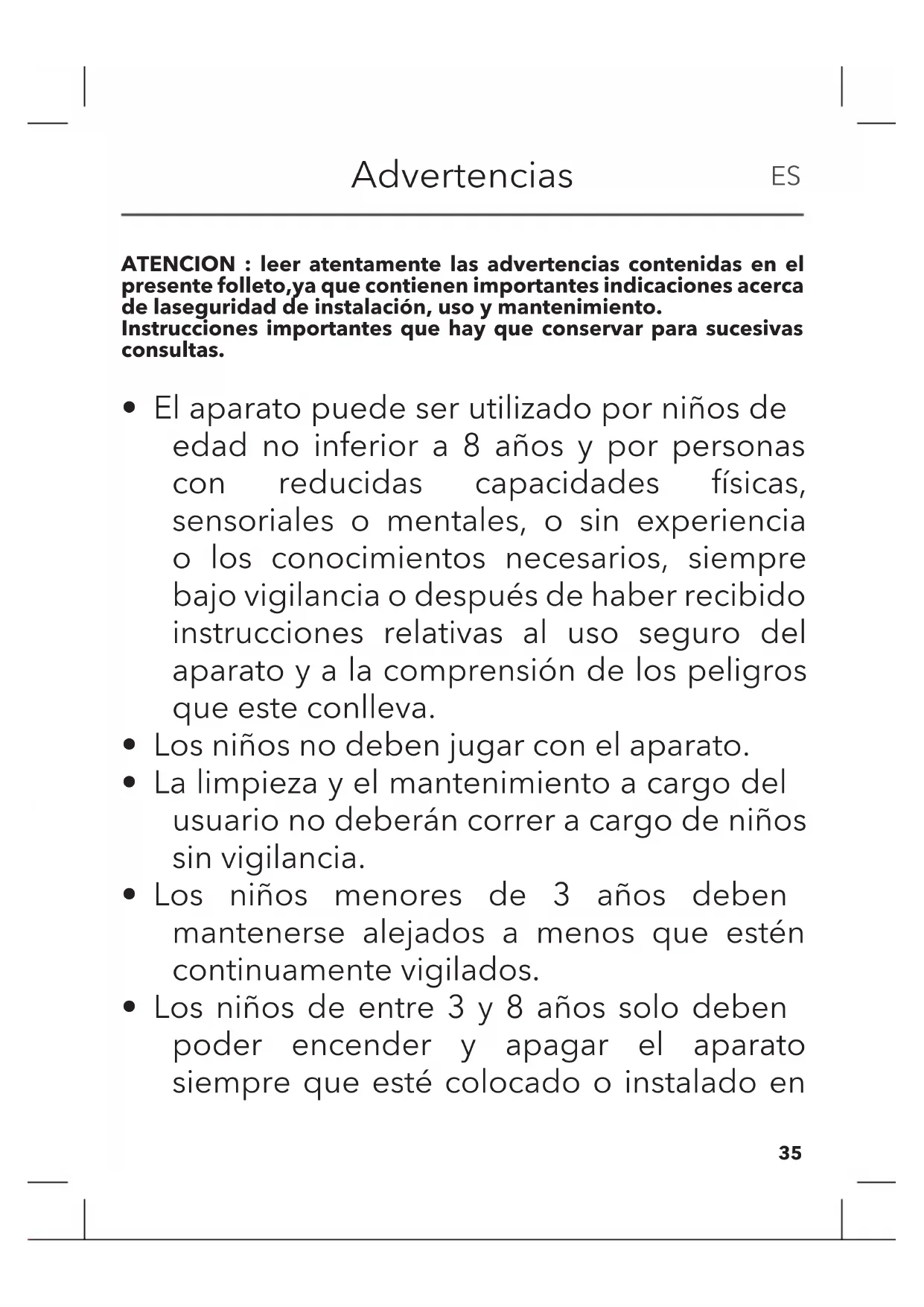 - Los niños de entre 3 y 8 años solo deben poder encender y apagar el aparato siempre que esté colocado o instalado en36 NO CUBRIR su posición normal de funcionamiento y que estén vigilados o hayan sido instruidos sobre el uso seguro del aparato y entiendan los peligros.