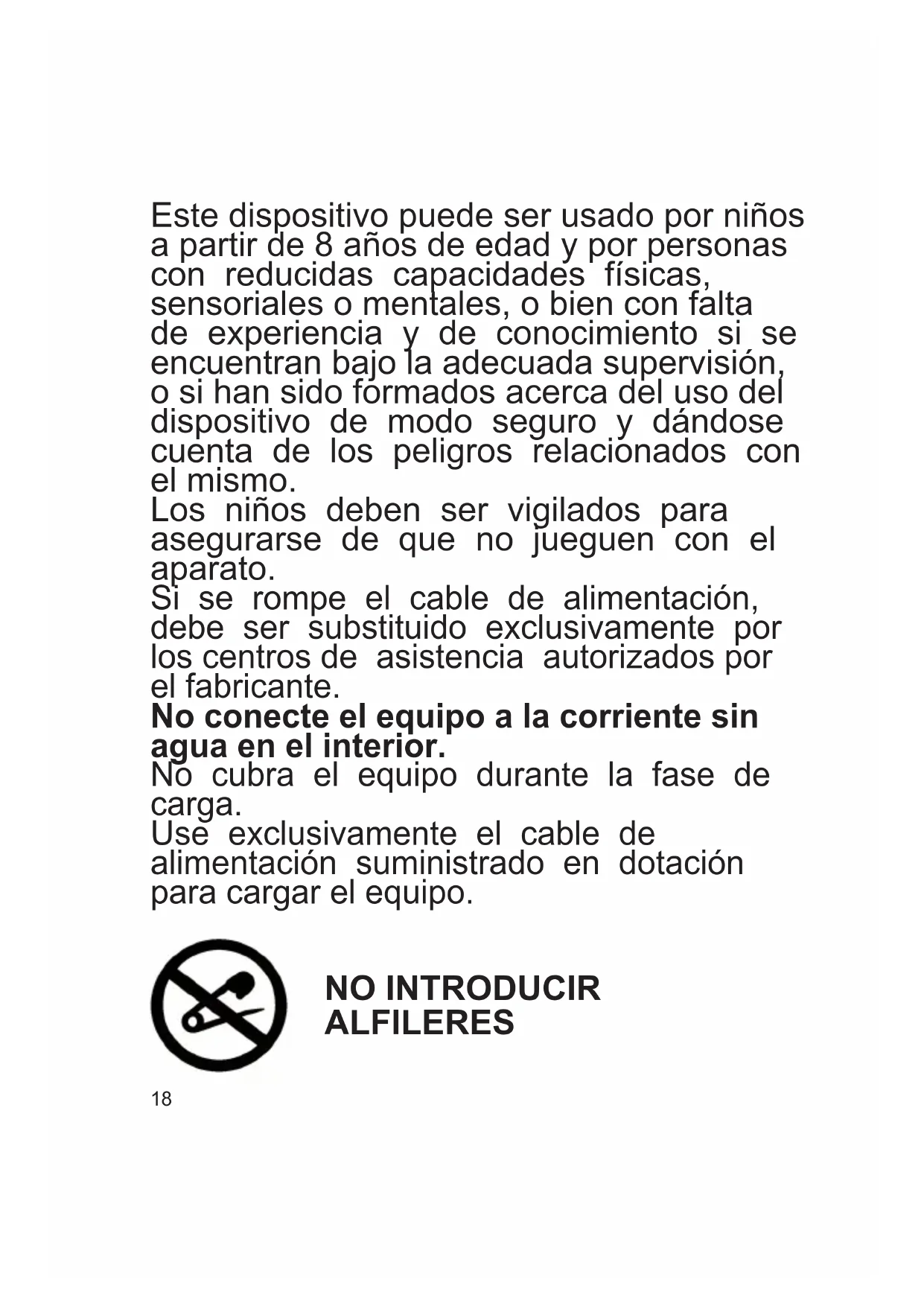 Este dispositivo puede ser usado por niños a partir de 8 años de edad y por personas con reducidas capacidades físicas, sensoriales o mentales, o bien con falta de experiencia y de conocimiento si se encuentran bajo la adecuada supervisión, o si han sido formados acerca del uso del dispositivo de modo seguro y dándose cuenta de los peligros relacionados con el mismo. Los niños deben ser vigilados para asegurarse de que no jueguen con el aparato. Si se rompe el cable de alimentación, debe ser substituido exclusivamente por los centros de asistencia autorizados por el fabricante. No conecte el equipo a la corriente sin agua en el interior. No cubra el equipo durante la fase de carga. Use exclusivamente el cable de alimentación suministrado en dotación para cargar el equipo.19 Advertencias
