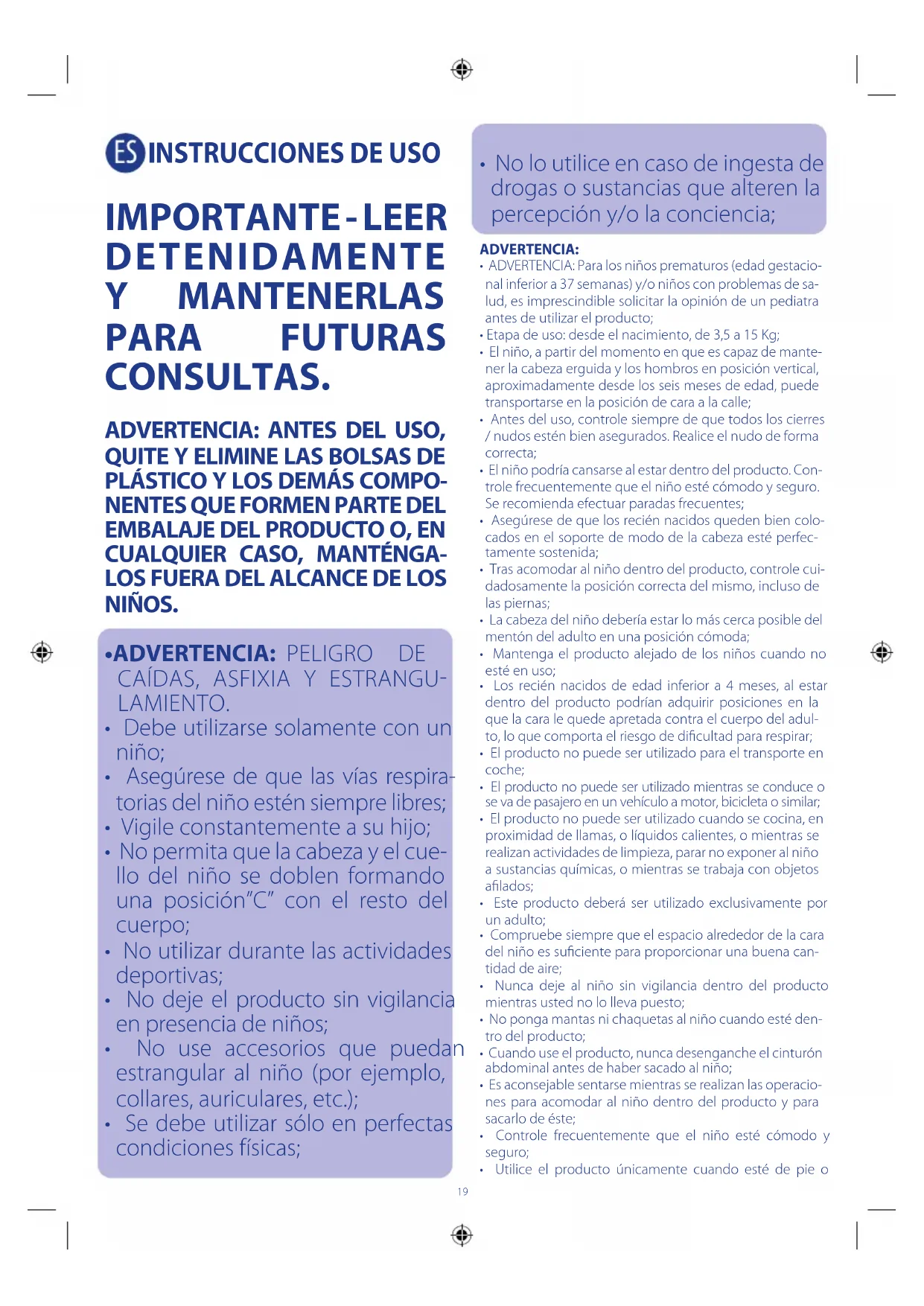 no tengan obstrucciones. Recomendamos que limite el tiempo que su bebealla en esta posicion, solo cuando el bebe está activo yiene curiosidad por mirar el mundo. Escuche las senales de su bebe: en caso de sobreestimulacion o cansancio es preferible llevarlo derente. No lo utilise nunca si el bebe está durmiendo.