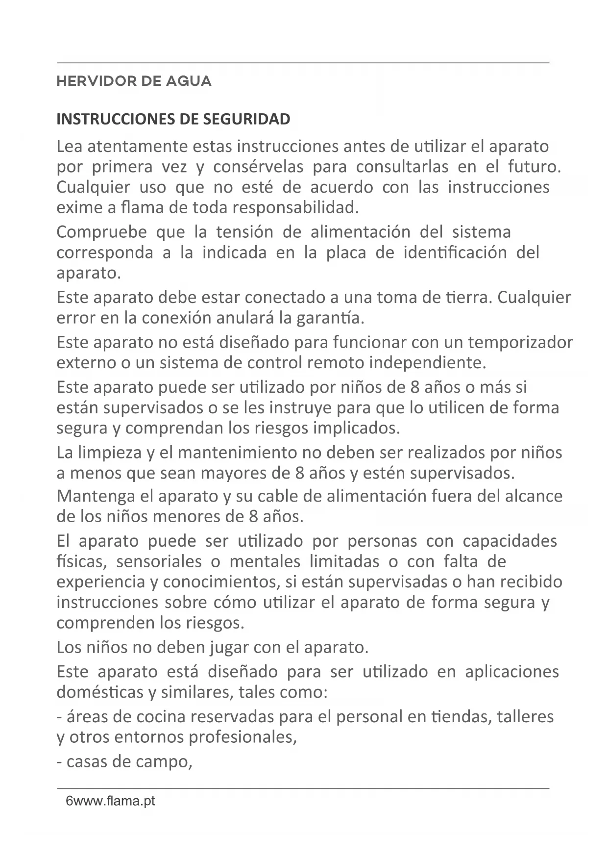 IMPORTANTE - Nunca sumerja el hervidor o la base de alimentación en agua o cualquier otro líquido. - Limpie el exterior del hervidor y la base de alimentación con un paño absorbente y seco. - Antes de reemplazar el hervidor en funcionamiento, desconecte el enchufe y limpie el agua con un paño seco y absorbente. - Nunca coloque el hervidor en funcionamiento sobre la base de alimentación mojada. FUNCIONAMIENTO El hervidor Flama ha sido diseñado para un uso sencillo, prácco, eciente y seguro. Disposivo sin cables: máxima facilidad de uso, limpieza y seguridad. El cable de alimentación es independiente del hervidor. Cierre de seguridad de la tapa: Garanza que no se abra la tapa al vaciar el agua. Desconexión automáca: el hervidor se desconecta automácamente cuando el agua empieza a hervir. Indicación de nivel máximo: el indicador del nivel de agua indica la candad máxima de agua que puede contener el hervidor (1.7Lt). Indicación de nivel: indica la candad de agua que se encuentra en el interior del hervidor. Enrollador del cable: para guardar mejor el aparato, enrolle el cable en la parte inferior de la base de alimentación.9 Español Antes del primer uso Limpie el interior del cuerpo y ponga agua a hervir (al menos una vez). Una vez hervida, vacíe el agua del aparato. Durante el primer uso, quizá note algún po de olor, pero es algo totalmente normal. Uso Desenrolle el cable de alimentación de la base de alimentación. Coloque la base de alimentación sobre una supercie plana y alejada de cualquier fuente de calor o llama. Abra la tapa del hervidor pulsando el botón de apertura de la tapa para desbloquear el cierre. Llene el hervidor con agua, sin la base de alimentación. No sobrepase nunca el indicador de nivel máximo, es decir, no llene el hervidor con más de 1,7 litros de agua. Ulice el indicador de nivel para comprobar la candad de agua que se encuentra en el interior del hervidor. Cierre completamente la tapa. Nunca ponga el hervidor a funcionar con la tapa abierta, ya que el sistema de ‘Desconexión automáca’ sólo funciona si la tapa está cerrada. Coloque el hervidor en la base de alimentación encajándolo completamente en el adaptador. Pulse el interruptor ON/OFF (A) para conectar el hervidor. Se encenderá el indicador luminoso, lo que indica que el hervidor está en funcionamiento. Cuando el agua entre en ebullición, el hervidor se desconectará automácamente. Se apagará el indicador luminoso. Rere el hervidor de la base de alimentación ulizando el asa para moverlo. Si desea obtener agua caliente, pero sin hervir, puede interrumpir el calentamiento situando el interruptor de ON/OFF en la posición ‘0’ y se desconectará automácamente (se apagará el indicador). Si quiere volver a calentar (recalentar) el agua, encaje el hervidor en la base de alimentación, sitúe el interruptor de ON/OFF en la posición ‘I’ para conectar el hervidor (se encenderá el indicador luminoso). Una vez que el agua entre en ebullición y el hervidor se desconecte automácamente, pueden aparecer algunas gotas de agua en la base de alimentación. Esto es algo normal ya que, durante el funcionamiento, se genera condensación y sale agua por los oricios del fondo del hervidor. Antes de poner nuevamente a funcionar el hervidor, desconecte el enchufe de la toma de corriente y limpie el agua con un paño seco y absorbente. Nunca ponga el hervidor en funcionamiento si la base de alimentación está mojada. Si por algún descuido se verese agua en la base de alimentación, proceda de la siguiente manera: - Desconecte el enchufe de la toma de corriente. - Limpie la base de alimentación con un paño seco y absorbente. - Limpie la supercie sobre la que reposa la base de alimentación. - Conecte el enchufe a la toma de corriente y reinicie el uso del aparato. Si por algún descuido pusiese a funcionar el hervidor sin agua, se conectará el disposivo de seguridad que evita el10 www.ama.pt sobrecalentamiento y desconectará el aparato. En este po de situaciones, rere el hervidor de la base de alimentación, déjelo enfriar, llénelo con agua sin sobrepasar el indicador del nivel máximo, coloque el hervidor en la base de alimentación y vuelva a conectarlo. Nunca eche agua fría cuando el hervidor esté muy caliente, ya que corre el riesgo de quemarse.