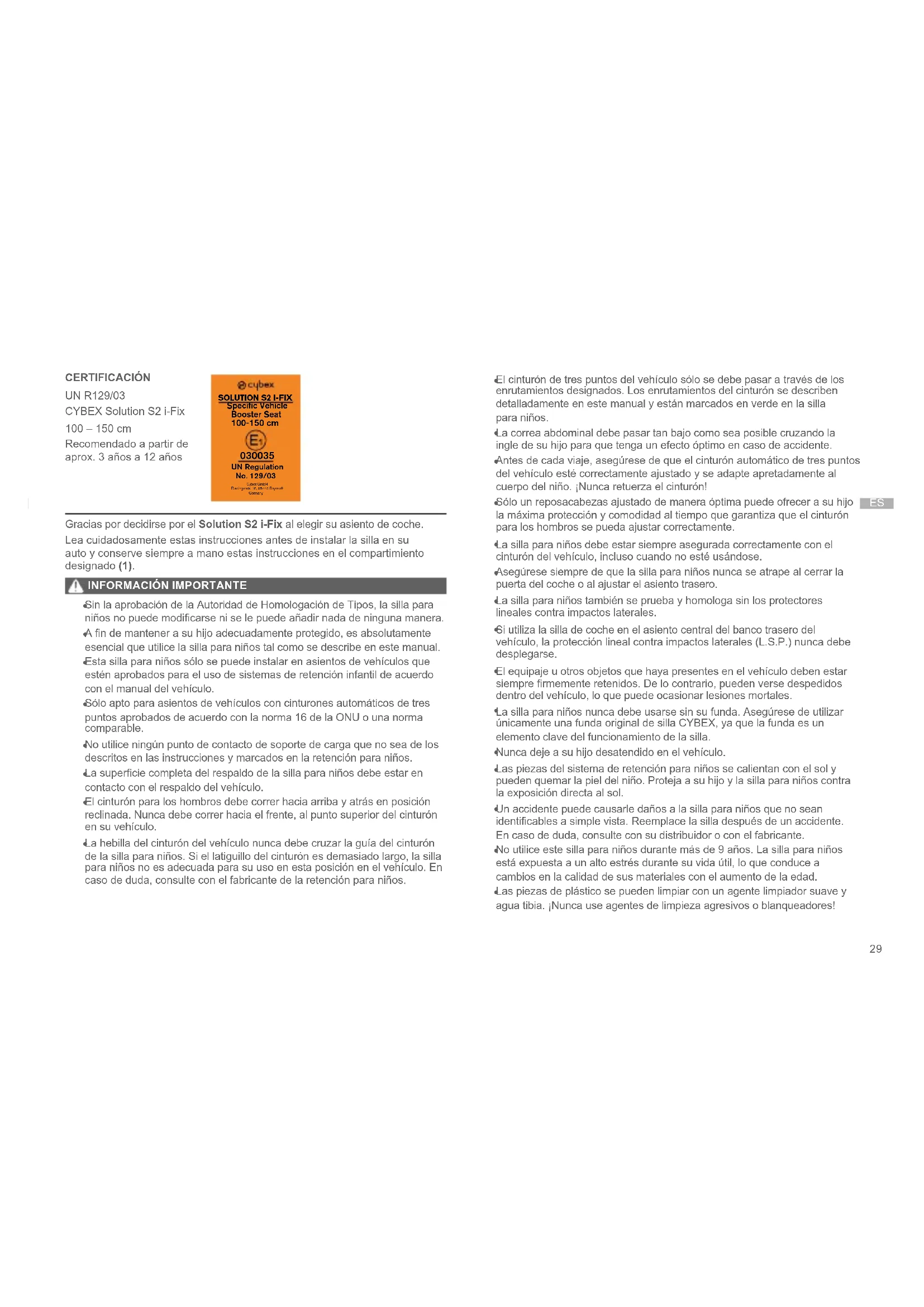 Gracias por decidirse por el Solution S2 i-Fix al elegir su asiento de coche. Lea cuidadosamente estas instrucciones antes de instalar la silla en su auto y conserve siempre a mano estas instrucciones en el compartimiento designado (1).