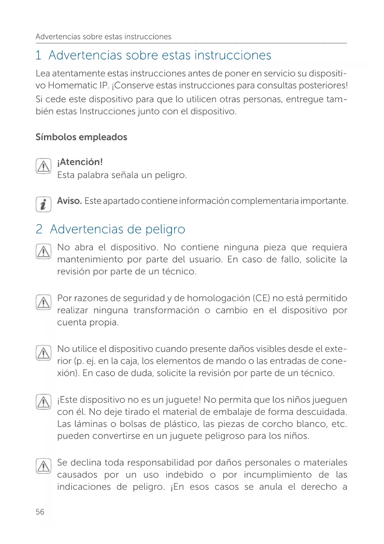 - 11 Datos técnicos Advertencias sobre estas instrucciones 1 Advertencias sobre estas instrucciones Lea atentamente estas instrucciones antes de poner en servicio su dispositi- vo Homematic IP. ¡Conserve estas instrucciones para consultas posteriores! Si cede este dispositivo para que lo utilicen otras personas, entregue tam p. 6756
