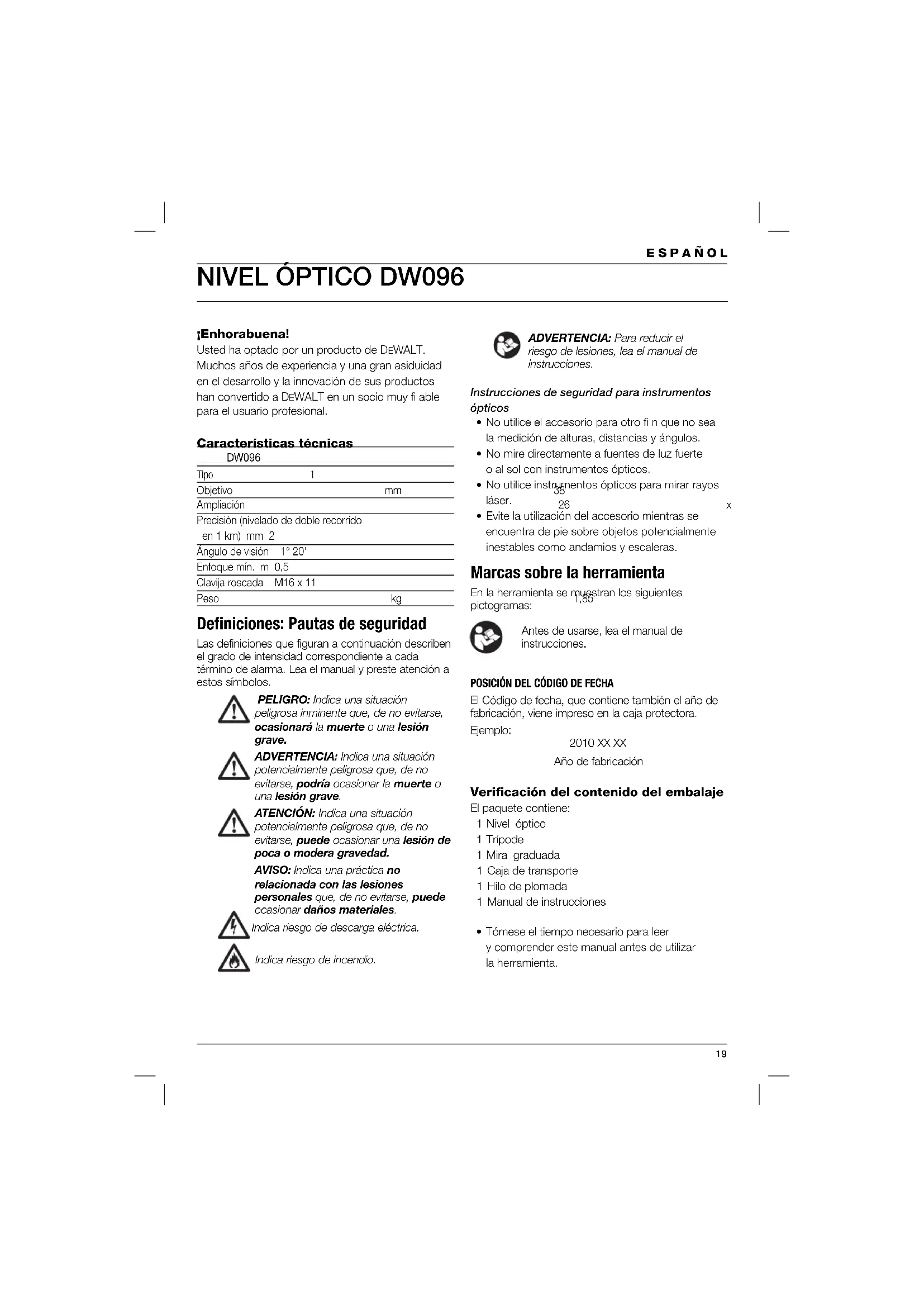 ¡Enhorabuena! Usted ha optado por un producto de DEWALT. Muchos años de experiencia y una gran asiduidad en el desarrollo y la innovación de sus productos han convertido a D EWALT en un socio muy fi able para el usuario profesional. Características técnicas DW096 Tipo 1 Objetivo mm 38 Ampliación 26 x Precisión (nivelado de doble recorrido en 1 km) mm 2 Ángulo de visión 1° 20' Enfoque mín. m 0,5 Clavija roscada M16 x 11 Peso kg 1,85 Defi niciones: Pautas de seguridad Las definiciones que figuran a continuación describen el grado de intensidad correspondiente a cada término de alarma. Lea el manual y preste atención a estos símbolos. PELIGRO: Indica una situación peligrosa inminente que, de no evitarse, ocasionará la muerte o una lesión grave. ADVERTENCIA: Indica una situación potencialmente peligrosa que, de no evitarse, podría ocasionar la muerte o una lesión grave. ATENCIÓN: Indica una situación potencialmente peligrosa que, de no evitarse, puede ocasionar una lesión de poca o modera gravedad. AVISO: Indica una práctica no relacionada con las lesiones personales que, de no evitarse, puede ocasionar daños materiales. Indica riesgo de descarga eléctrica. Indica riesgo de incendio. ADVERTENCIA: Para reducir el riesgo de lesiones, lea el manual de instrucciones. Instrucciones de seguridad para instrumentos ópticos