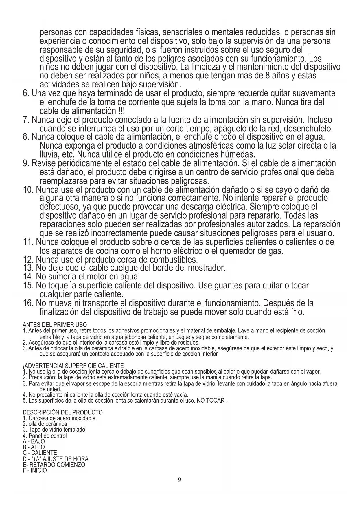 5. Las superficies de la olla de cocción lenta se calentarán durante el uso. NO TOCAR .