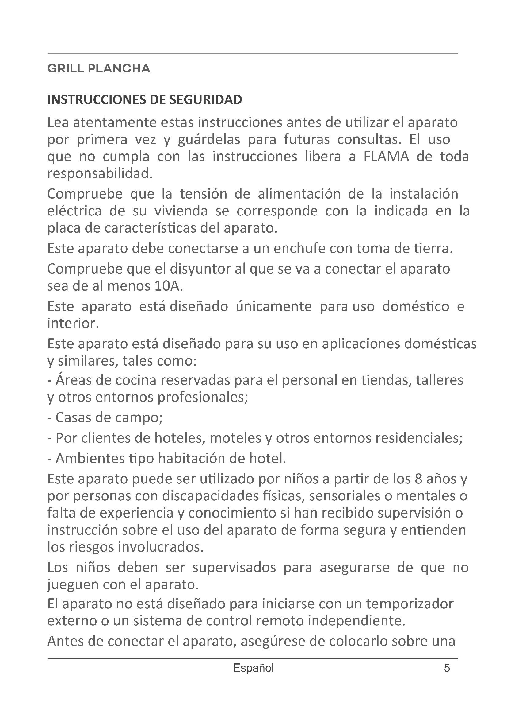 Lea atentamente estas instrucciones antes de ulizar el aparato por primera vez y guárdelas para futuras consultas. El uso que no cumpla con las instrucciones libera a FLAMA de toda responsabilidad. Compruebe que la tensión de alimentación de la instalación eléctrica de su vivienda se corresponde con la indicada en la placa de caracteríscas del aparato. Este aparato debe conectarse a un enchufe con toma de erra. Compruebe que el disyuntor al que se va a conectar el aparato sea de al menos 10A. Este aparato está diseñado únicamente para uso domésco e interior. Este aparato está diseñado para su uso en aplicaciones doméscas y similares, tales como: - Áreas de cocina reservadas para el personal en endas, talleres y otros entornos profesionales; - Casas de campo; - Por clientes de hoteles, moteles y otros entornos residenciales; - Ambientes po habitación de hotel. Este aparato puede ser ulizado por niños a parr de los 8 años y por personas con discapacidades sicas, sensoriales o mentales o falta de experiencia y conocimiento si han recibido supervisión o instrucción sobre el uso del aparato de forma segura y enenden los riesgos involucrados. Los niños deben ser supervisados para asegurarse de que no jueguen con el aparato. El aparato no está diseñado para iniciarse con un temporizador externo o un sistema de control remoto independiente. Antes de conectar el aparato, asegúrese de colocarlo sobre una GRILL PLANCHA6 www.ama.pt supercie plana, estable y horizontal. La limpieza y el mantenimiento del aparato no deben ser realizados por niños a menos que sean mayores de 8 años y estén supervisados. Mantenga el aparato y su cable de alimentación fuera del alcance de los niños menores de 8 años, cuando esté encendido o cuando se esté enfriando. Advertencia: las temperaturas de las supercies accesibles pueden ser altas durante el funcionamiento. Desconecte el aparato de la fuente de alimentación quitando el enchufe de la toma de corriente ja después de cada uso y durante la limpieza. Deje que se enfríe antes de realizar cualquier operación de limpieza o almacenamiento. No ulice el aparato si no funciona correctamente o si presenta algún po de daño. Cualquier intervención disnta de la limpieza debe ser realizada por un Servicio de Asistencia Técnica Autorizado FLAMA. Si el cable de alimentación está dañado, debe ser reemplazado por el fabricante, su servicio posventa o personal calicado similar para evitar riesgos. El aparato nunca debe usarse cerca de materiales inamables o combusbles. Nunca deje el aparato desatendido. No cubra el aparato durante el funcionamiento. No desmonte el aparato. El aparato sólo debe ulizarse para cocinar alimentos. Su uso para otros nes puede causar daños irreparables. Nunca sumerja el aparato en agua o cualquier otro líquido. ADVERTENCIA: No se debe ulizar carbón u otros combusbles con este aparato.7 Español Este producto cumple con las Direcvas de Compabilidad Electromagnéca y Baja Tensión. Este manual de instrucciones también está disponible en formato PDF en www.ama.pt. DESCRIPCIÓN