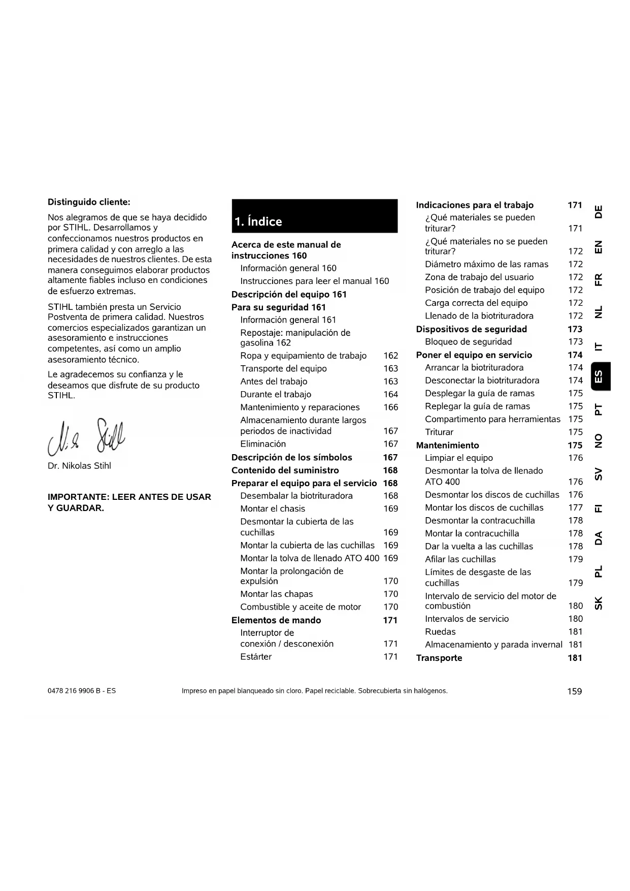 DEENFRNLITPTNOSVFIDAPLSK ES 0478 216 9906 B - ES Distinguido cliente: Nos alegramos de que se haya decidido por STIHL. Desarrollamos y confeccionamos nuestros productos en primera calidad y con arreglo a las necesidades de nuestros clientes. De esta manera conseguimos elaborar productos altamente fiables incluso en condiciones de esfuerzo extremas. STIHL también presta un Servicio Postventa de primera calidad. Nuestros comercios especializados garantizan un asesoramiento e instrucciones competentes, así como un amplio asesoramiento técnico. Le agradecemos su confianza y le deseamos que disfrute de su producto STIHL. Dr. Nikolas Stihl