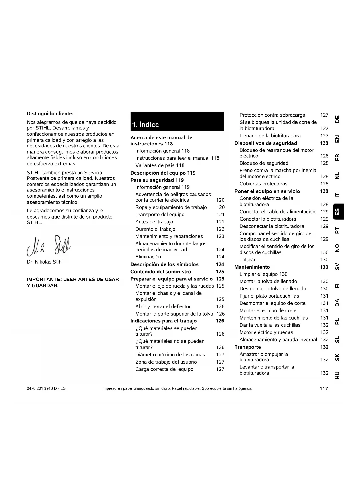 Acerca de este manual de instrucciones 118 Información general 118 Instrucciones para leer el manual 118 Variantes de país 118 Descripción del equipo 119 Para su seguridad 119 Información general 119 Advertencia de peligros causados por la corriente eléctrica 120 Ropa y equipamiento de trabajo 120 Transporte del equipo 121 Antes del trabajo 121 Durante el trabajo 122 Mantenimiento y reparaciones 123 Almacenamiento durante largos periodos de inactividad 124 Eliminación 124 Descripción de los símbolos 124 Contenido del suministro 125 Preparar el equipo para el servicio 125 Montar el eje de rueda y las ruedas 125 Montar el chasis y el canal de expulsión 125 Abrir y cerrar el deflector 126 Montar la parte superior de la tolva 126 Indicaciones para el trabajo 126 ¿Qué materiales se pueden triturar? 126 ¿Qué materiales no se pueden triturar? 126 Diámetro máximo de las ramas 127 Zona de trabajo del usuario 127 Carga correcta del equipo 127 Protección contra sobrecarga 127 Si se bloquea la unidad de corte de la biotrituradora 127 Llenado de la biotrituradora 127 Dispositivos de seguridad 128 Bloqueo de rearranque del motor eléctrico 128 Bloqueo de seguridad 128 Freno contra la marcha por inercia del motor eléctrico 128 Cubiertas protectoras 128 Poner el equipo en servicio 128 Conexión eléctrica de la biotrituradora 128 Conectar el cable de alimentación 129 Conectar la biotrituradora 129 Desconectar la biotrituradora 129 Comprobar el sentido de giro de los discos de cuchillas 129 Modificar el sentido de giro de los discos de cuchillas 130 Triturar 130 Mantenimiento 130 Limpiar el equipo 130 Montar la tolva de llenado 130 Desmontar la tolva de llenado 130 Fijar el plato portacuchillas 131 Desmontar el equipo de corte 131 Montar el equipo de corte 131 Mantenimiento de las cuchillas 131 Dar la vuelta a las cuchillas 132 Motor eléctrico y ruedas 132 Almacenamiento y parada invernal 132 Transporte 132 Arrastrar o empujar la biotrituradora 132 Levantar o transportar la biotrituradora 1320478 201 9913 D - ES