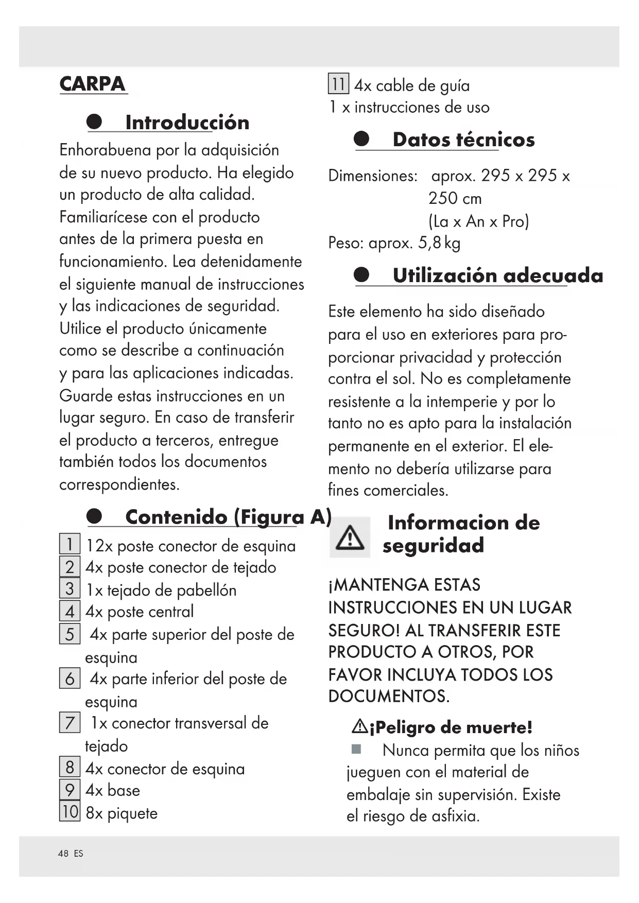4x cable de guía 1 x instrucciones de uso Datos técnicos Dimensiones: aprox. 295 x 295 x 250 cm (La x An x Pro) Peso: aprox. 5,8 kg Utilización adecuada Este elemento ha sido diseñado para el uso en exteriores para pro- porcionar privacidad y protección contra el sol. No es completamente resistente a la intemperie y por lo tanto no es apto para la instalación permanente en el exterior. El ele- mento no debería utilizarse para fines comerciales. Informacion de seguridad ¡MANTENGA ESTAS