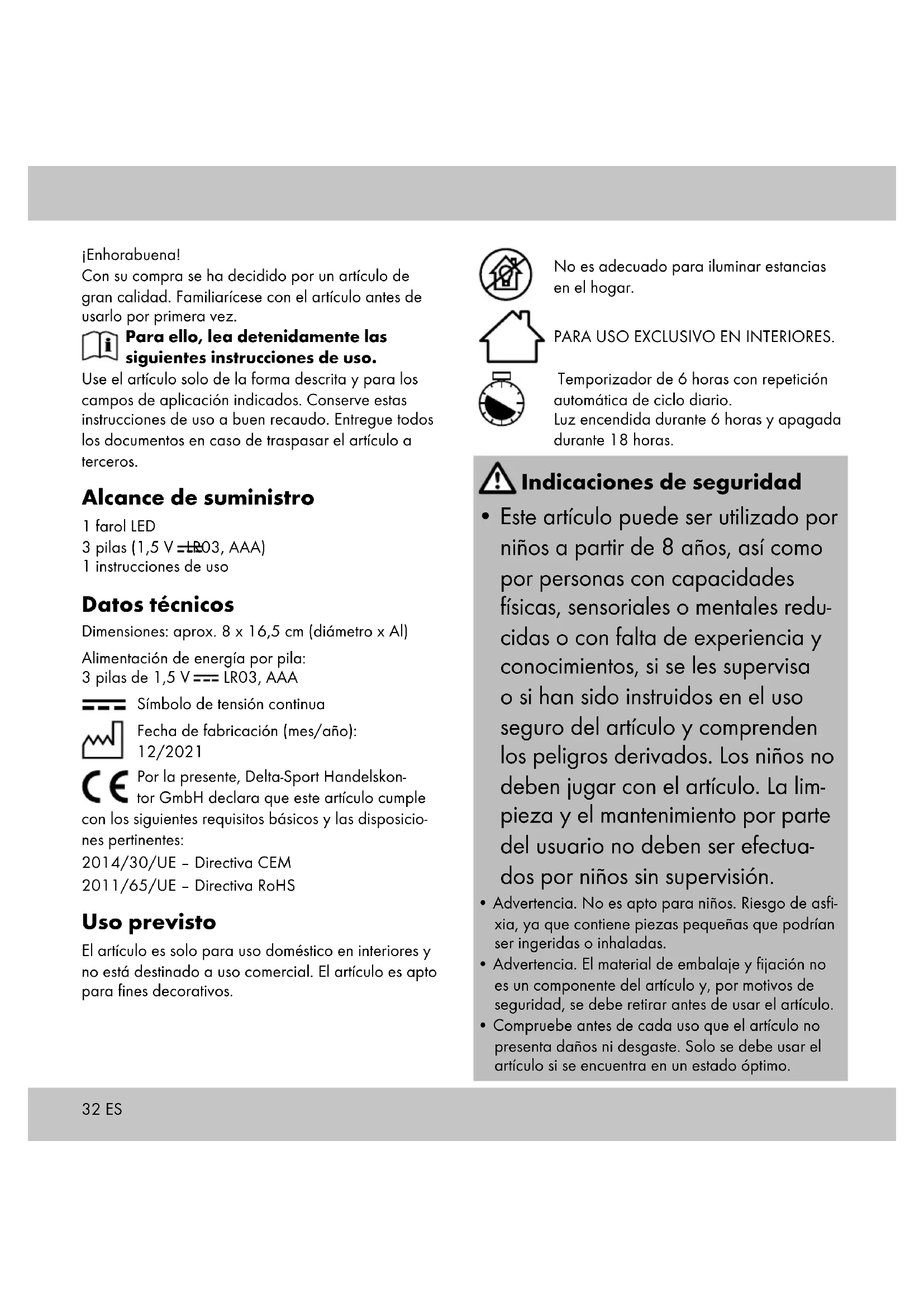 pilas (1a). Cambio de las pilas Si las pilas ya no funcionan, se pueden cambiar. Para ello, siga los pasos descritos en la sección de «Colocación de las pilas». Antes de colocar las pilas nuevas, retire las usadas del compartimento de las pilas. Encendido y apagado de la luz (Fig. A) Deslice el interruptor (1c) a la posición ON para encender el artículo (1). Deslice el interruptor (1c) a la posición OFF para apagar el artículo. Mueva el interruptor (1c) a la posición TIMER para activar el temporizador del artículo. Nota: Con la función de temporizador la luz perma- nece encendida 6 horas y apagada otras 18 horas. ES34 ES Utilización El artículo se puede colocar o suspender en una zona interior. Nota: No coloque el artículo sobre superficies deli- cadas. Esto puede causar arañazos. Al colgar el artículo, tenga en cuenta su peso propio. Almacenamiento, limpieza Si no va a utilizarlo, almacene siempre el artículo seco y limpio, sin pilas y a temperatura ambiente. Limpie solo con un paño de limpieza húmedo y des- pués seque frotándolo. ¡IMPORTANTE! No lo limpie con productos de limpie- za agresivos. Indicaciones para la eliminación Cuando ya no se pueda volver a usar, no deseche el artículo con la basura doméstica, sino que, por el bien del medio ambiente, elimínelo de forma correcta. Puede informarse acerca de los centros de recogida y sus horarios de apertura en una administración competente. Las pilas/acumuladores se deben reciclar de conformidad con la directiva 2006/66/EG y sus enmiendas. Deseche las pilas/acumuladores o el artículo en las instalaciones de recogida disponibles. Los materiales de embalaje, como bolsas de plástico, no se deben dejar en manos de los niños. Conserve el material de embalaje fuera del alcance de los niños. Daños medioambientales por la eliminación incorrecta de pilas/acumuladores. No deseche las pilas/acumuladores con la basura doméstica. Pueden contener metales pesados y deben ser tratados como residuos especiales. Los símbolos químicos de los metales pesados son estos: Cd = cadmio, Hg = mercurio, Pb = plomo. Por ello, elimine las pilas/acumuladores en un punto de recogida comunitario. Deseche el artículo y el embalaje de manera respetuosa con el medio ambiente. Al separar los residuos, tenga en cuenta la marcación de los materiales de embalaje, que se indica con abreviaturas (a) y números (b) que significan lo siguiente: 1-7: plásticos/20-22: papel y cartón/80-98: materiales compuestos. El artículo y su material de embalaje son reciclables, deséchelos separados para un mejor tratamiento de los residuos. El logo «Triman» solo se aplica en Fran- cia. Para más información sobre la eliminación del artículo, acuda a su ayuntamiento o a las autoridades municipales. Indicaciones relativas a la garantía y la gestión de servicios El artículo ha sido fabricado con gran esmero y sometido a controles constantes. Para el mismo, DELTA-SPORT HANDELSKONTOR GmbH ofrece a los clientes finales particulares una garantía de tres años a contar desde la fecha de compra (periodo de garantía) con arreglo a las condiciones que se exponen a continuación. La garantía tiene validez únicamente para fallos del material y fabricación. La garantía no cubre las piezas sometidas a un desgaste normal, las cuales se consideran piezas de desgaste (p. ej., pilas) así como tampoco piezas frágiles como, p. ej., interruptores, baterías o piezas fabricadas en vidrio o cristal. Se excluyen derechos derivados de esta garantía, si se ha realizado un uso incorrecto o abusivo del artículo o que no se encuentre dentro del marco del uso o ámbito de uso previstos o si no se ha observado lo recogido en el manual de instrucciones, a no ser que el cliente final demuestre que existen fallos del material o fabricación no derivados de una de las circunstancias expuestas anteriormente.35 Las demandas derivadas de la garantía sólo podrán presentarse dentro del periodo de garantía exhibien- do el comprobante de compra original. Le rogamos, por ello, que conserve el comprobante de compra original. El periodo de garantía no se verá prolongado por ningún tipo de reparación realizada con motivo de la garantía, la garantía legal o como gesto de buena vo- luntad. Esto se aplica también a las piezas sustituidas o reparadas. Por favor, dirija sus quejas primero a la línea telefó- nica del servicio de atención al cliente que se indica a continuación o póngase en contacto con nosotros por correo electrónico. Si el caso está cubierto por la garantía, a nuestra elección, repararemos o cambia- remos gratuitamente el artículo o le restituiremos el precio de compra del mismo. De la garantía no se derivan otros derechos. Esta garantía no limitará sus derechos legales, espe- cialmente los derechos de garantía frente al vendedor correspondiente. IAN: 398633_2107 Servicio España Tel.: 900 984 989 E-Mail: deltasport@lidl.es ES36 DK Hjertelig tillykke! Du har valgt at købe et kvalitetsprodukt. Lær produktet at kende, inden du bruger det første gang. Det gør du ved at læse nedenstående brugervejledning omhyggeligt. Brug kun produktet som beskrevet og til de angivne anvendelsesområder. Opbevar denne brugervejled- ning et sikkert sted. Udlever også alle dokumenter, hvis produktet videregives til en tredjepart. Leveringsomfang 1 x LED lanterne 3 x batteri (1,5 V LR03, AAA) 1 x brugervejledning Tekniske data Mål: ca. 8 x 16,5 cm (Ø x h) Strømforsyning, batteri: 3 x 1,5 V LR03, AAA Symbol for jævnspænding Fremstillingsdato (måned/år): 12/2021 Hermed erklærer Delta-Sport Handelskon- tor GmbH, at denne artikel er i overensstem- melse med følgende grundlæggende krav og de øvrige gældende bestemmelser: 2014/30/EU – EMC-direktiv 2011/65/EU – RoHS-direktiv Bestemmelsesmæssig brug Artiklen er kun beregnet til privat, indendørs brug og ikke til erhvervsmæssig brug. Artiklen egner sig til dekorationsformål. Ikke egnet til almindelig