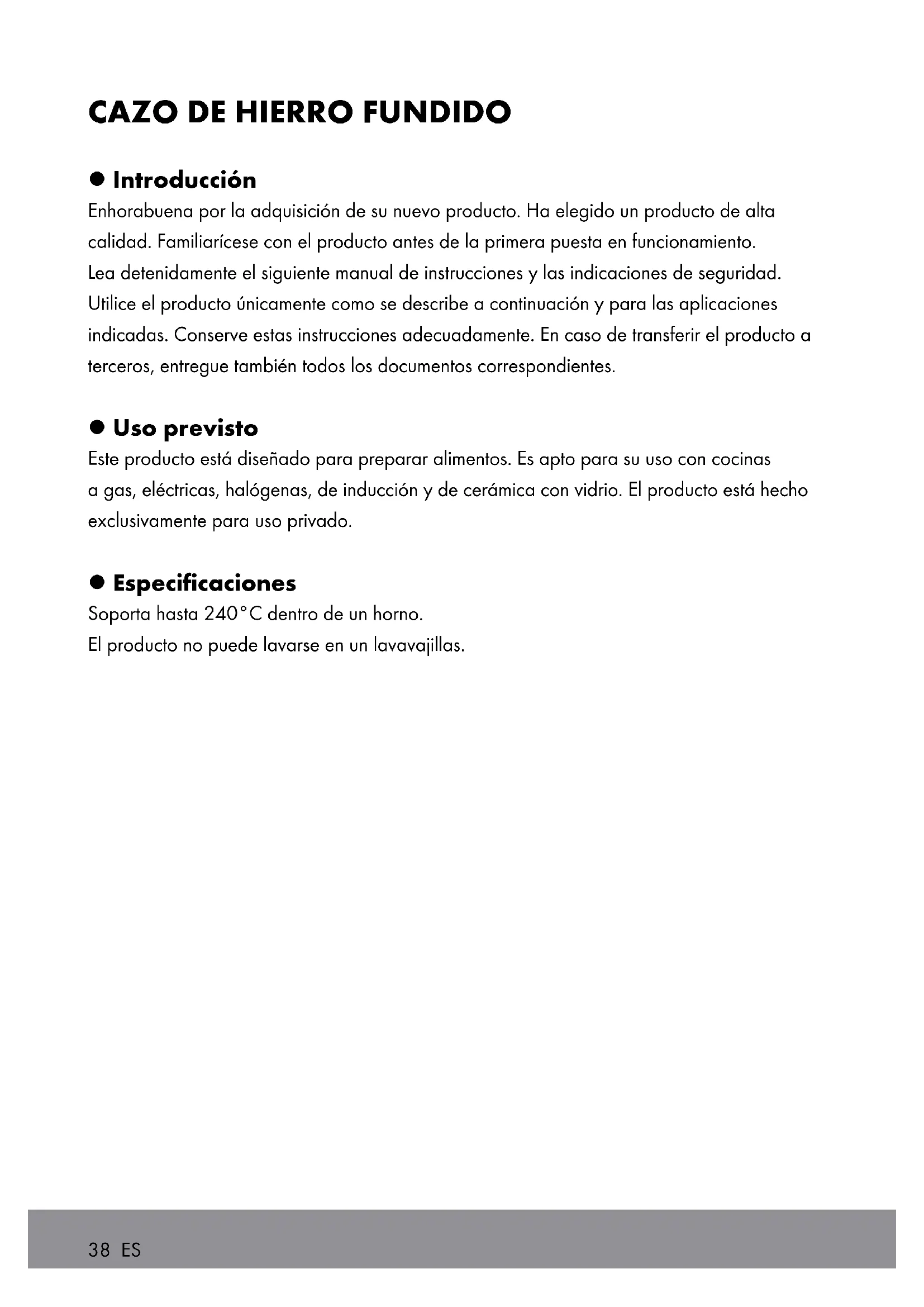 l Introducción Enhorabuena por la adquisición de su nuevo producto. Ha elegido un producto de alta calidad. Familiarícese con el producto antes de la primera puesta en funcionamiento. Lea detenidamente el siguiente manual de instrucciones y las indicaciones de seguridad. Utilice el producto únicamente como se describe a continuación y para las aplicaciones indicadas. Conserve estas instrucciones adecuadamente. En caso de transferir el producto a terceros, entregue también todos los documentos correspondientes. l Uso previsto Este producto está diseñado para preparar alimentos. Es apto para su uso con cocinas a gas, eléctricas, halógenas, de inducción y de cerámica con vidrio. El producto está hecho exclusivamente para uso privado. l Especificaciones Soporta hasta 240°C dentro de un horno. El producto no puede lavarse en un lavavajillas.ES 39 Instrucciones de seguridad ¡GUARDE TODAS LAS INSTRUCCIONES DE SEGURIDAD E INSTRUCCIONES GENERALES PARA SU USO A FUTURO! n Tenga cuidado con las manijas, ya que éstas se calienten mucho al cocinar. Por lo tanto, utilice mitones o guantes para barbacoa por su propia seguridad. n Cuando el producto esté caliente, déjelo sobre una base a prueba de calor y no sobre una encimera sin protección. n Al cocinar, es extremadamente importante no perder de vista al producto mientras calienta grasa en él. La grasa puede sobrecalentarse muy rápidamente y encenderse. En caso de haber un incendio provocado por grasa, ¡jamás intente extinguirlo con agua! Ahogue las llamas con una tapa o frazada de lana gruesa. n Asegúrese de jamás calentar el producto mientras esté vacío. No hacerlo puede provocar que la cobertura de esmalte se quiebre. n Para evitar daños a la cobertura de esmalte, utilice solo utensilios de cocina hechos de plástico resistente al calor o madera. No corte alimentos directamente en el producto. n Jamás deje carnes húmedas que choreen en grasa caliente. La grasa de las salpicaduras podría entrar en contacto con un elemento calefactor encendido y comenzar un incendio. n ¡Precaución! Levante siempre el producto al cocinar en un horno o sobre hornillos con superficie de vidrio (hornillos de cerámica con vidrio, halógenos y de inducción). JAMÁS deslice el producto sobre este tipo de superficies, ya que puede generar daños al fondo del producto, al hornillo o al horno. n Ajuste siempre las llamas para que cubran el fondo del producto; las llamas de gas JAMÁS deben salir por los costados del producto. n El producto no puede usarse en el microondas. n ¡El producto puede usarse en un horno! Soporta hasta 240°C dentro de un horno. Deje el producto en una bandeja del horno, no directamente en el piso del horno. n El producto no puede lavarse en un lavavajillas. n No utilice la tapa si su manija se suelta. Reapriete la tapa cuando sea necesario. n ¡SEGURIDAD PARA SUS ALIMENTOS! El sabor y los aromas de sus alimentos no se ven afectados por este producto. n ADVERTENCIA! PELIGRO DE VIDA Y ACCIDENTE POR NIÑO Y NIÑOS! Nunca dejes niños sin supervisión con el material de embalaje. Existe peligro de asfixia. Mantenga a los niños alejados del producto. n ADVERTENCIA! Nunca deje niños desatendidos en el Cerca de utensilios de cocina calientes.40 ES lUso n Antes del primer uso, hierva agua 2 - 3 veces en el producto para así eliminar cualquier residuo del proceso de producción. Luego, limpie el producto con agua jabonosa tibia, enjuague con agua limpia y seque exhaustivamente. n Pase un poco de aceite o mantequilla en la parte interior del producto. Caliente lentamente el producto a baja temperatura. Baje la temperatura apenas la grasa se empape. Espera aprox. 2 - 3 minutos hasta que el producto se haya enfriado y elimine cualquier exceso de grasa. n No cocine ni rostice a alta temperatura. El hierro fundido es excelente para retener el calor, por lo una temperatura media es más que suficiente. Una temperatura demasiado alta genera resultados de cocción insatisfactorios o provoca que los alimentos se peguen (por ejemplo, en un omelet). n No caliente el producto demasiado rápido. No hacerlo puede provocar que la cobertura de esmalte se quiebre; esto sucede cuando el hierro fundido se expande más rápido que el esmalte. Tenga en cuenta: n El esmalte ligero del interior del producto está especialmente diseñado para preparar alimentos lentamente a baja temperatura o a temperatura media en un horno. n Las protuberancias del fondo de la tapa provocan circulación dentro del plato durante la cocción. El vapor que se eleva se condensa en la tapa y se distribuye de manera pareja a los alimentos que esté preparando mediante las protuberancias. Esto se traduce en que sus alimentos quedan jugosos durante la cocción y retienen su sabor natural. n La superficie de esmalte no es apta para cocinar en seco. Utilice siempre un poco de mantequilla o aceite de cocina y asegúrese de que la parte inferior del producto quede completamente cubierta antes de calentar el plato.ES 41 lInformación para el uso con hornillos de inducción Seleccione un tamaño de quemador que se corresponda con el tamaño del fondo del producto para evitar pérdida de calor. n Tamaño efectivo del fondo aprox. 11,5 cm Tenga en cuenta: Bajo ciertas circunstancias, las propiedades electromagnéticas del hornillo y del producto pueden provocar la aparición de olores. Esto es algo normal y no indica daños a su hornillo de inducción o al plato de cocina. n Deje el producto al centro del hornillo de inducción. n ¡PRECAUCIÓN! ¡Alta tasa de calentamiento! Al precalentar el plato de cocina, tenga cuidado de no sobrecalentarlo. n En caso de sobrecalentamiento, airee la habitación exhaustivamente. lLimpieza y cuidado n Deje siempre que el producto se enfríe levemente antes de limpiarlo. Jamás sumerja el producto en agua fría mientras siga caliente. El golpe de temperatura podría dañar al esmalte. Además, no llene el producto con agua fría. n Enjuague su