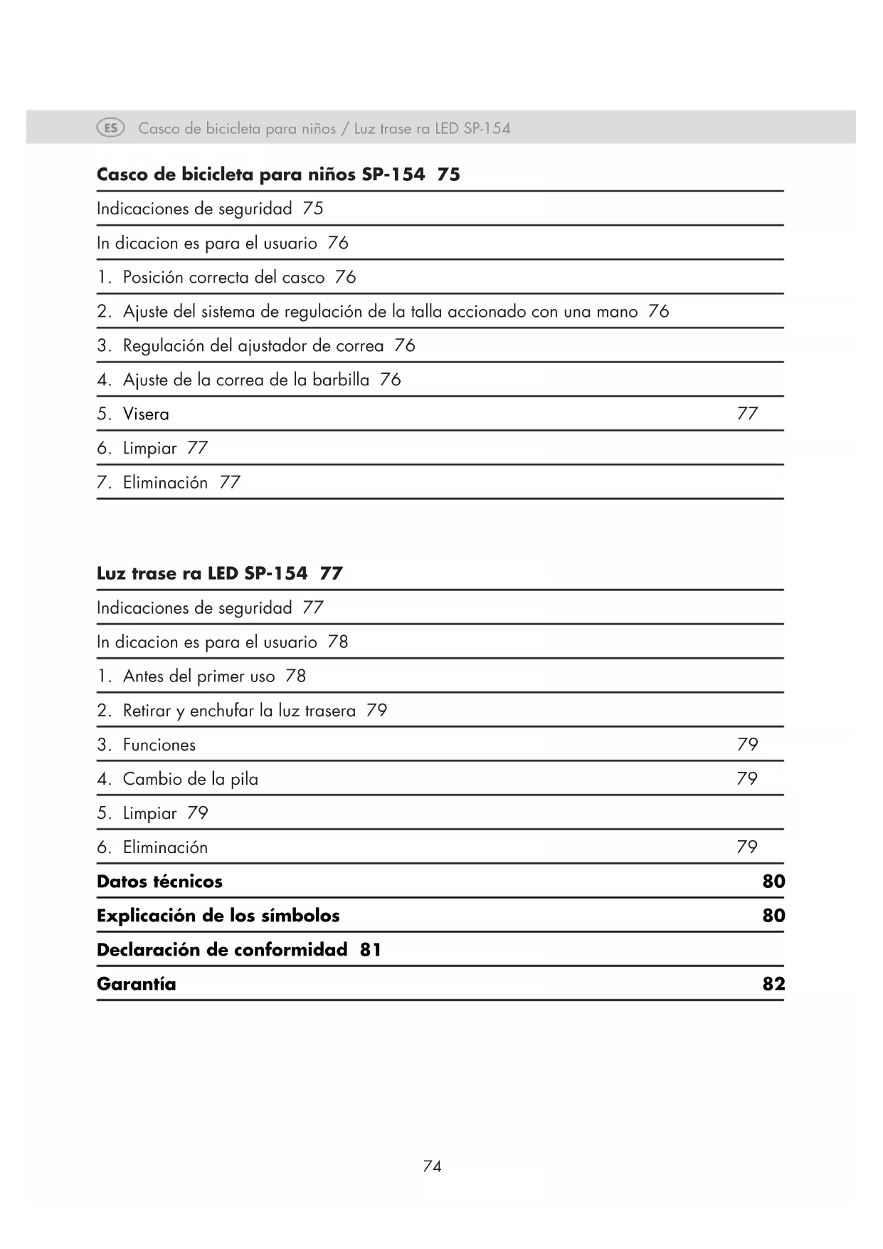 Datos técnicos 80 Explicación de los símbolos 80 Declaración de conformidad 81 Garantía 8274 75 Casco de bicicleta para niños / Luz trase ra LED SP-154