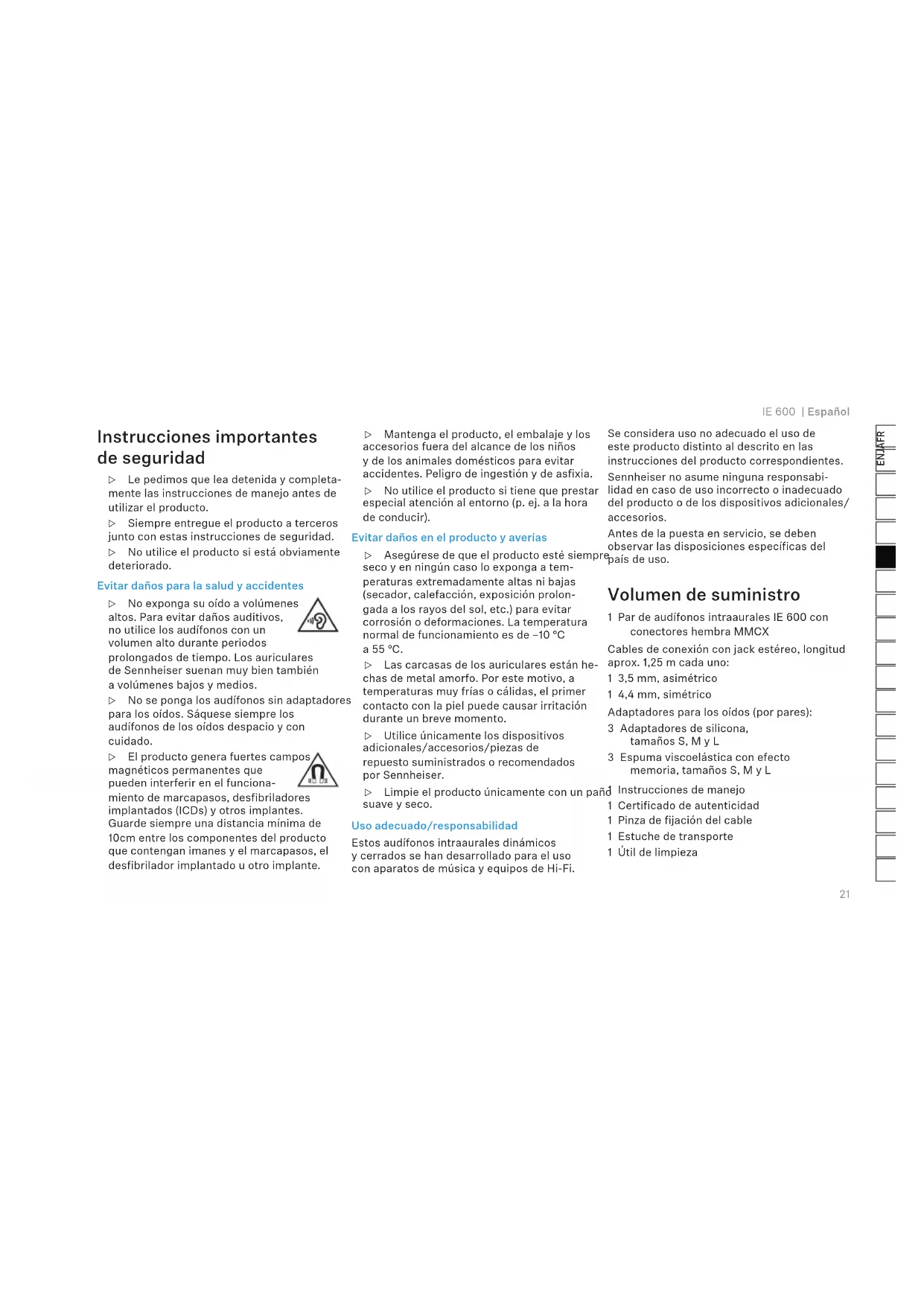 IE 600 | Español Instrucciones importantes de seguridad ▷ Le pedimos que lea detenida y completa- mente las instrucciones de manejo antes de utilizar el producto. ▷ Siempre entregue el producto a terceros junto con estas instrucciones de seguridad. ▷ No utilice el producto si está obviamente deteriorado. Evitar daños para la salud y accidentes ▷ No exponga su oído a volúmenes altos. Para evitar daños auditivos, no utilice los audífonos con un volumen alto durante periodos prolongados de tiempo. Los auriculares de Sennheiser suenan muy bien también a volúmenes bajos y medios. ▷ No se ponga los audífonos sin adaptadores para los oídos. Sáquese siempre los audífonos de los oídos despacio y con cuidado. ▷ El producto genera fuertes campos magnéticos permanentes que pueden interferir en el funciona- miento de marcapasos, desfibriladores implantados (ICDs) y otros implantes. Guarde siempre una distancia mínima de 10cm entre los componentes del producto que contengan imanes y el marcapasos, el desfibrilador implantado u otro implante. ▷ Mantenga el producto, el embalaje y los accesorios fuera del alcance de los niños y de los animales domésticos para evitar accidentes. Peligro de ingestión y de asfixia. ▷ No utilice el producto si tiene que prestar especial atención al entorno (p. ej. a la hora de conducir). Evitar daños en el producto y averías ▷ Asegúrese de que el producto esté siempre seco y en ningún caso lo exponga a tem- peraturas extremadamente altas ni bajas (secador, calefacción, exposición prolon- gada a los rayos del sol, etc.) para evitar corrosión o deformaciones. La temperatura normal de funcionamiento es de –10 °C a 55 °C. ▷ Las carcasas de los auriculares están he- chas de metal amorfo. Por este motivo, a temperaturas muy frías o cálidas, el primer contacto con la piel puede causar irritación durante un breve momento. ▷ Utilice únicamente los dispositivos adicionales/accesorios/piezas de repuesto suministrados o recomendados por Sennheiser. ▷ Limpie el producto únicamente con un paño suave y seco. Uso adecuado/responsabilidad Estos audífonos intraaurales dinámicos y cerrados se han desarrollado para el uso con aparatos de música y equipos de Hi-Fi. Se considera uso no adecuado el uso de este producto distinto al descrito en las instrucciones del producto correspondientes. Sennheiser no asume ninguna responsabi- lidad en caso de uso incorrecto o inadecuado del producto o de los dispositivos adicionales/ accesorios. Antes de la puesta en servicio, se deben observar las disposiciones específicas del país de uso. Volumen de suministro 1 Par de audífonos intraaurales IE 600 con conectores hembra MMCX Cables de conexión con jack estéreo, longitud aprox. 1,25 m cada uno: 1 3,5 mm, asimétrico 1 4,4 mm, simétrico Adaptadores para los oídos (por pares): 3 Adaptadores de silicona, tamaños S, M y L 3 Espuma viscoelástica con efecto memoria, tamaños S, M y L 1 Instrucciones de manejo 1 Certificado de autenticidad 1 Pinza de fijación del cable 1 Estuche de transporte 1 Útil de limpieza22 Español | IE 600 Sus Sennheiser IE 600 La reproducción del sonido ideal: auténtico y claro. Esto es lo que representan los IE 600. Unos audífonos que siguen los pasos del buque insignia de los audífonos para audiófilos Sennheiser IE 900. Basados en los elogiados transductores TrueResponse, los IE 600 cuentan con las cámaras de resonancia "Dual 2 Chamber Absorber", que ayudan a la configuración del sonido a conseguir un espacio directo y enfocado. Las voces pasan al primer plano y construyen un puente entre usted y la música, de modo que el mundo que le rodea desaparece. Una reproducción neutra del sonido pero con un potente rango de graves muestra de lo que son capaces los transductores dinámicos intraaurales de 7 mm con el uso consecuente de décadas de investigación y experiencia. La reproducción equilibrada ofrece unos agudos limpios que no dividen la música de forma analítica. Los IE 600 demuestran la pasión de Sennheiser por reproducir el sonido ideal y experimentar un momento personal íntimo con la música. Los IE 600 son fabricados por un equipo de expertos en la planta especializada en au- riculares de Tullamore, Irlanda. Para cada audífono para audiófilos se aplican las más estrictas tolerancias de producción. Cada transductor se prueba completamente, tanto individualmente antes como juntos después de emparejar los lados derecho e izquierdo de los audífonos. Los transductores de los lados derecho e izquierdo se seleccionan para que se ajusten de forma óptima entre sí. Los transductores están encerrados en una carcasa que nunca antes se había visto en esta forma para los auriculares para audió- filos. Mediante la fusión selectiva por láser se consiguió que la carcasa se convirtiera en un metal con estructuras amorfas capa a capa. El resultado es un material extremadamente duro y resistente a las influencias ambientales que, debido a sus propiedades y al complejo proceso de producción, se utilizó primera- mente en la tecnología aeroespacial o médica. Además, la superficie metálica rugosa de la aleación de circonio-cobre-aluminio-niobio es una verdadera atracción. Los IE 600 ofrecen además una excelente conectividad con conexiones Fidelity+ MMCX. Estas precisas conexiones se han optimizado para el uso móvil de los audífonos. Gracias al elevado revestimiento de las conexiones de enchufe, los contactos de filigrana están muy bien protegidos contra las cargas mecánicas. En el lado del dispositivo, los jacks de 3,5 mm y 4,4 mm están disponibles de serie. La guía de cables sobre la oreja con ganchos ajustables garantiza una sensación de ligereza y una reducción del ruido corporal en comparación con los cables estándar. Para que pueda disfrutar incluso de horas de audición con estos exclusivos audífonos IE 600 de Sennheiser. Encontrará figuras en la página desplegable.