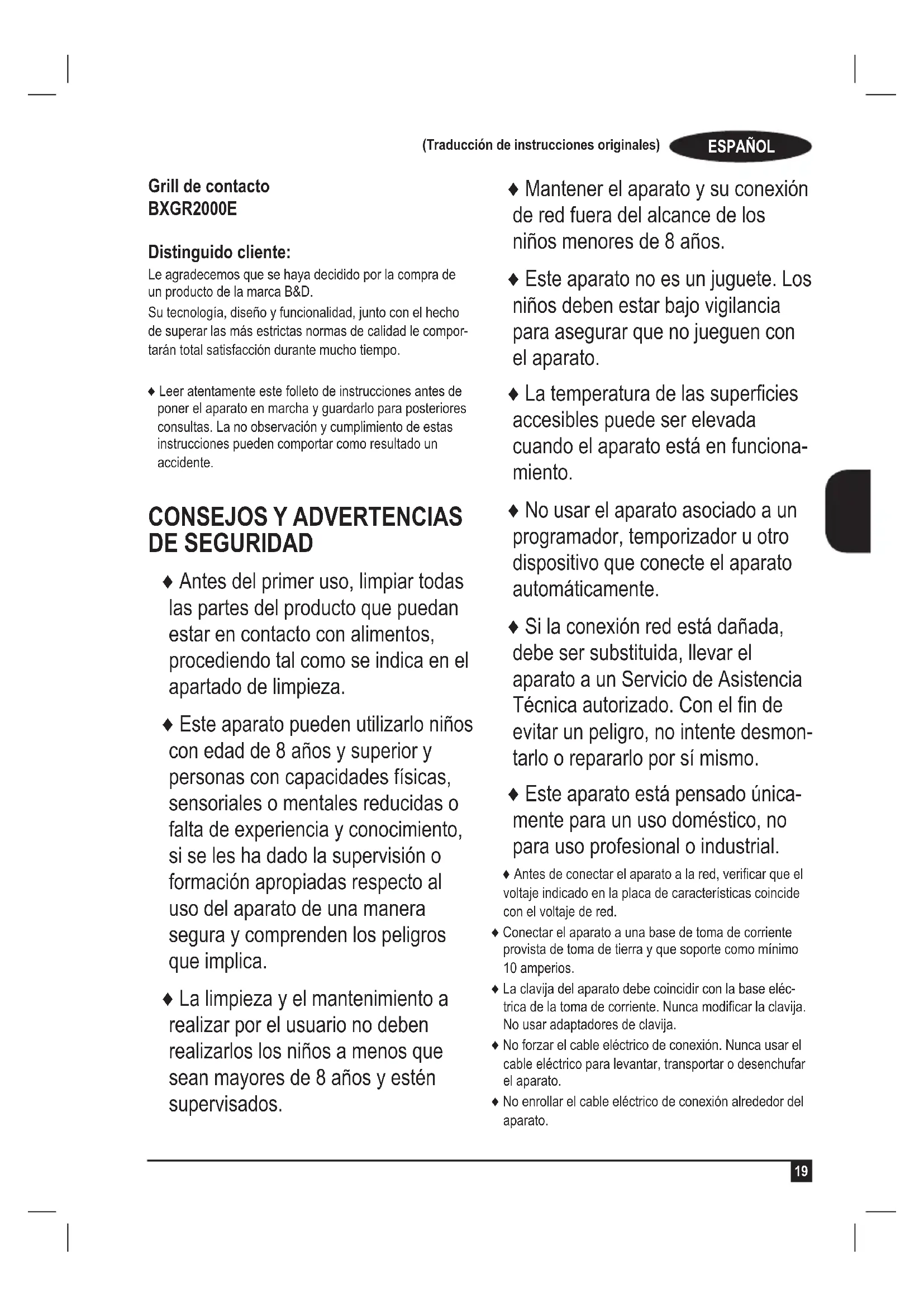 Grill de contacto BXGR2000E Distinguido cliente: Le agradecemos que se haya decidido por la compra de un producto de la marca B&D. Su tecnología, diseño y funcionalidad, junto con el hecho de superar las más estrictas normas de calidad le compor- tarán total satisfacción durante mucho tiempo. ♦ Leer atentamente este folleto de instrucciones antes de poner el aparato en marcha y guardarlo para posteriores consultas. La no observación y cumplimiento de estas instrucciones pueden comportar como resultado un accidente.