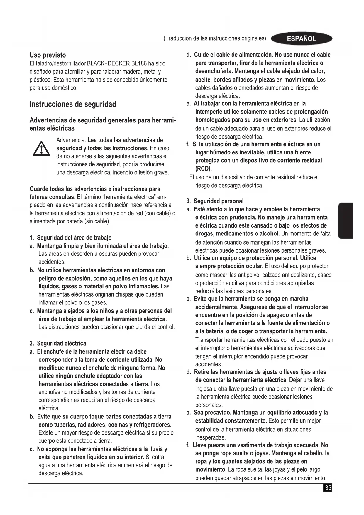 Taladro/destornillador BL186Black & Decker declara que los productos descritos en el apartado “Datos técnicos” son conformes a las normas siguientes:2006/42/CE, EN60745-1:2009+A11:2010 EN60745-2-1:2010 EN60745-2-2:2010Estos productos también cumplen con la Directiva2014/30/UE y 2011/65/UE. Si desea más información, póngase en contacto con Black & Decker en la dirección indicada a continuación o bien consulte la parte posterior de este manual.El que suscribe es responsable de la compilación del archivo técnico y realiza esta declaración en nombre de Black & Decker.R. LaverickDirector de ingenieríaBlack & Decker Europa, 210 Bath Road, Slough,Berkshire, SL1 3YDReino Unido19/07/2016 Garantía Black & Decker confía en la calidad de sus productos y ofrece a los consumidores una garantía de 24 meses a partir de la fecha de compra. Esta garantía es adicional a sus derechos legales y no los menoscaba en modo alguno. La garantía es válida dentro de los territorios de los Estados Miembros de la Unión Europea y del Área de Libre Comercio Europea.Para reclamar la garantía, la reclamación se debe presentar de conformidad con las condiciones de Black & Decker. Tendrá que adjuntar un justicante de compra al vendedor o al agente técnico autorizado. Las condiciones de la garantía de 2 años de Black & Decker y la ubicación de su agente técnico autorizado más cercano se pueden obtener en Internet en www.2helpU.com o poniéndose en contacto con su ocina local de Black & Decker en la direc-ción que se indica en este manual. Visite nuestro sitio web www.blackanddecker.co.uk para registrar su nuevo producto Black & Decker y recibir noticias sobre nuevos productos y ofertas especiales.(Tradução das instruções originais) PORTUGUÊS Utilização pretendida O seu berbequim/aparafusadora BLACK+DECKER BL186 foi concebido para aparafusar e para perfurar madeira, metal e plástico. Esta ferramenta destina-se apenas para utilização doméstica. Instruções de segurança Avisos de segurança gerais para ferramentas eléctricas