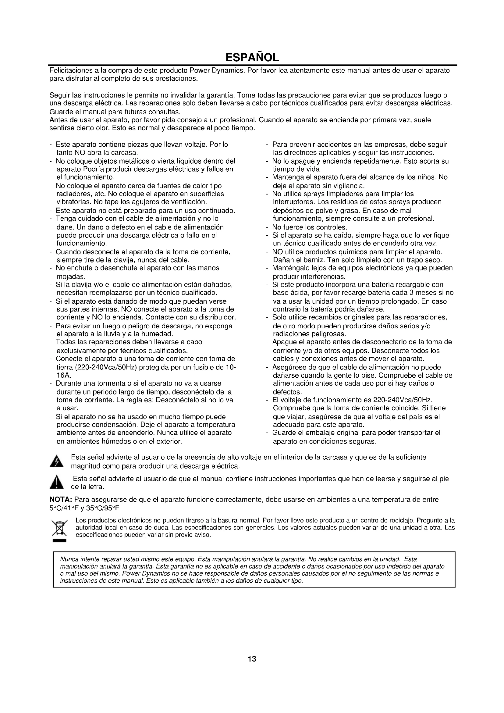 Hinweis: Das BT hat eine Reichweite von etwa 10 Metern ohne jede Barriere.13 ESPAÑOL Felicitaciones a la compra de este producto Power Dynamics. Por favor lea atentamente este manual antes de usar el aparato para disfrutar al completo de sus prestaciones. Seguir las instrucciones le permite no invalidar la garantía. Tome todas las precauciones para evitar que se produzca fuego o una descarga eléctrica. Las reparaciones solo deben llevarse a cabo por técnicos cualificados para evitar descargas eléctricas. Guarde el manual para futuras consultas. Antes de usar el aparato, por favor pida consejo a un profesional. Cuando el aparato se enciende por primera vez, suele sentirse cierto olor. Esto es normal y desaparece al poco tiempo. - Este aparato contiene piezas que llevan voltaje. Por lo tanto NO abra la carcasa. - No coloque objetos metálicos o vierta líquidos dentro del aparato Podría producir descargas eléctricas y fallos en el funcionamiento. - No coloque el aparato cerca de fuentes de calor tipo radiadores, etc. No coloque el aparato en superficies vibratorias. No tape los agujeros de ventilación. - Este aparato no está preparado para un uso continuado. - Tenga cuidado con el cable de alimentación y no lo dañe. Un daño o defecto en el cable de alimentación puede producir una descarga eléctrica o fallo en el funcionamiento. - Cuando desconecte el aparato de la toma de corriente, siempre tire de la clavija, nunca del cable. - No enchufe o desenchufe el aparato con las manos mojadas. - Si la clavija y/o el cable de alimentación están dañados, necesitan reemplazarse por un técnico cualificado. - Si el aparato está dañado de modo que puedan verse sus partes internas, NO conecte el aparato a la toma de corriente y NO lo encienda. Contacte con su distribuidor. - Para evitar un fuego o peligro de descarga, no exponga el aparato a la lluvia y a la humedad. - Todas las reparaciones deben llevarse a cabo exclusivamente por técnicos cualificados. - Conecte el aparato a una toma de corriente con toma de tierra (220-240Vca/50Hz) protegida por un fusible de 10- 16A. - Durante una tormenta o si el aparato no va a usarse durante un periodo largo de tiempo, desconéctelo de la toma de corriente. La regla es: Desconéctelo si no lo va a usar. - Si el aparato no se ha usado en mucho tiempo puede producirse condensación. Deje el aparato a temperatura ambiente antes de encenderlo. Nunca utilice el aparato en ambientes húmedos o en el exterior. - Para prevenir accidentes en las empresas, debe seguir las directrices aplicables y seguir las instrucciones. - No lo apague y encienda repetidamente. Esto acorta su tiempo de vida. - Mantenga el aparato fuera del alcance de los niños. No deje el aparato sin vigilancia. - No utilice sprays limpiadores para limpiar los interruptores. Los residuos de estos sprays producen depósitos de polvo y grasa. En caso de mal funcionamiento, siempre consulte a un profesional. - No fuerce los controles. - Si el aparato se ha caído, siempre haga que lo verifique un técnico cualificado antes de encenderlo otra vez. - NO utilice productos químicos para limpiar el aparato. Dañan el barniz. Tan solo límpielo con un trapo seco. - Manténgalo lejos de equipos electrónicos ya que pueden producir interferencias. - Si este producto incorpora una batería recargable con base ácida, por favor recarge bateria cada 3 meses si no va a usar la unidad por un tiempo prolongado. En caso contrario la batería podría dañarse. - Solo utilice recambios originales para las reparaciones, de otro modo pueden producirse daños serios y/o radiaciones peligrosas. - Apague el aparato antes de desconectarlo de la toma de corriente y/o de otros equipos. Desconecte todos los cables y conexiones antes de mover el aparato. - Asegúrese de que el cable de alimentación no puede dañarse cuando la gente lo pise. Compruebe el cable de alimentación antes de cada uso por si hay daños o defectos. - El voltaje de funcionamiento es 220-240Vca/50Hz. Compruebe que la toma de corriente coincide. Si tiene que viajar, asegúrese de que el voltaje del país es el adecuado para este aparato. - Guarde el embalaje original para poder transportar el aparato en condiciones seguras. Esta señal advierte al usuario de la presencia de alto voltaje en el interior de la carcasa y que es de la suficiente magnitud como para producir una descarga eléctrica. Esta señal advierte al usuario de que el manual contiene instrucciones importantes que han de leerse y seguirse al pie de la letra. NOTA: Para asegurarse de que el aparato funcione correctamente, debe usarse en ambientes a una temperatura de entre 5°C/41°F y 35°C/95°F. Los productos electrónicos no pueden tirarse a la basura normal. Por favor lleve este producto a un centro de reciclaje. Pregunte a la autoridad local en caso de duda. Las especificaciones son generales. Los valores actuales pueden variar de una unidad a otra. Las especificaciones pueden variar sin previo aviso.