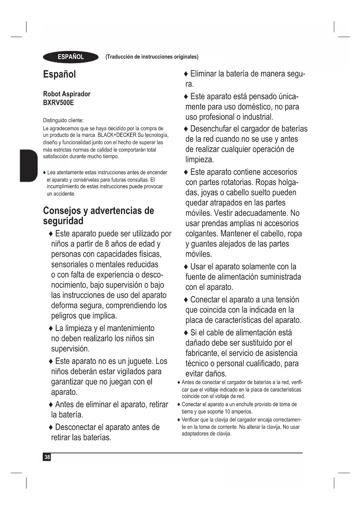 Español Robot Aspirador BXRV500E Distinguido cliente: Le agradecemos que se haya decidido por la compra de un producto de la marca BLACK+DECKER Su tecnología, diseño y funcionalidad junto con el hecho de superar las más estrictas normas de calidad le comportarán total satisfacción durante mucho tiempo. ♦ Lea atentamente estas instrucciones antes de encender el aparato y consérvelas para futuras consultas. El incumplimiento de estas instrucciones puede provocar un accidente. Consejos y advertencias de seguridad ♦ Este aparato puede ser utilizado por niños a partir de 8 años de edad y personas con capacidades físicas, sensoriales o mentales reducidas o con falta de experiencia o desco- nocimiento, bajo supervisión o bajo las instrucciones de uso del aparato deforma segura, comprendiendo los peligros que implica. ♦ La limpieza y el mantenimiento no deben realizarlo los niños sin supervisión. ♦ Este aparato no es un juguete. Los niños deberán estar vigilados para garantizar que no juegan con el aparato. ♦ Antes de eliminar el aparato, retirar la batería. ♦ Desconectar el aparato antes de retirar las baterías. ♦ Eliminar la batería de manera segu- ra. ♦ Este aparato está pensado única- mente para uso doméstico, no para uso profesional o industrial. ♦ Desenchufar el cargador de baterías de la red cuando no se use y antes de realizar cualquier operación de limpieza. ♦ Este aparato contiene accesorios con partes rotatorias. Ropas holga- das, joyas o cabello suelto pueden quedar atrapados en las partes móviles. Vestir adecuadamente. No usar prendas amplias ni accesorios colgantes. Mantener el cabello, ropa y guantes alejados de las partes móviles. ♦ Usar el aparato solamente con la fuente de alimentación suministrada con el aparato. ♦ Conectar el aparato a una tensión que coincida con la indicada en la placa de características del aparato. ♦ Si el cable de alimentación está dañado debe ser sustituido por el fabricante, el servicio de asistencia técnico o personal cualicado, para evitar daños. ♦ Antes de conectar el cargador de baterías a la red, veri- car que el voltaje indicado en la placa de características coincide con el voltaje de red. ♦ Conectar el aparato a un enchufe provisto de toma de tierra y que soporte 10 amperios. ♦ Vericar que la clavija del cargador encaja correctamen- te en la toma de corriente. No alterar la clavija. No usar adaptadores de clavija.ESPAÑOL (Traducción de instrucciones originales)