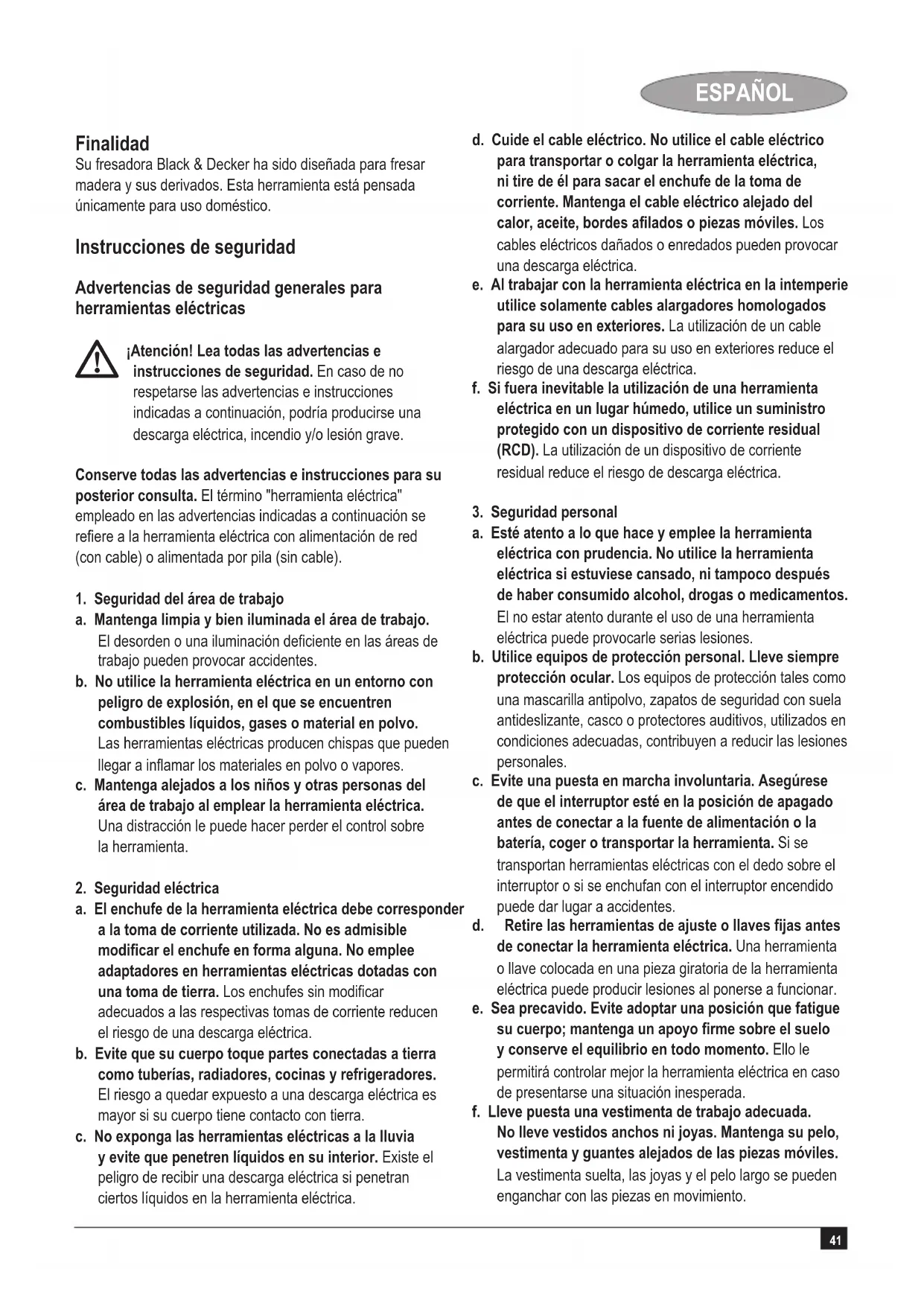 ¡Atención! Advertencias de seguridad adicionales para fresadoras u Sujete la herramienta eléctrica únicamente por las empuñaduras aisladas, porque la broca de fresado puede tocar su propio cable. Cortar un cable con corriente puede hacer que las partes metálicas al descubierto de la herramienta eléctrica provoquen una descarga al usuario. u Utilicemordazasuotraformaprácticaparajary soportar la pieza de trabajo a una plataforma estable. Sujetar el trabajo a mano o contra su cuerpo hace que pierda estabilidad y puede provocar la pérdida de control. ¡Atención! El contacto o la inhalación de polvo desprendido por aplicaciones de fresado, puede poner en peligro la salud del operario y la de aquellos próximos a usted. Utilice una mascarilla contra el polvo diseñada especícamente para proteger contra el polvo y las emanaciones y asegúrese de que las demás personas que se encuentren dentro de, o que penetren en el área de trabajo, también estén protegidas. u Elimine a fondo todo el polvo después de fresar.u Utilice únicamente brocas de fresado cuyo diámetro de vástago sea igual al tamaño del portaherramientas instalado en la herramienta. u Utilice únicamente brocas de fresado que se adapten a la velocidad sin carga de la herramienta. u No utilice nunca brocas de fresado cuyo diámetro sea superior al máximo especicado en la sección dedicada a información sobre características técnicas. u No use la herramienta en posición invertida.u No trate de utilizar la herramienta en modo estático.u Si el cable eléctrico está estropeado, debe ser sustituido por el fabricante o un servicio técnico autorizado de Black & Decker con el n de evitar accidentes. u Tenga especial cuidado al fresar cuando haya pintura que pueda tener base de plomo o cuando frese maderas que puedan producir polvo tóxico. - No permita la entrada de niños ni de mujeres embarazadas al área de trabajo. - No ingiera alimentos, beba o fume en la zona de trabajo. - Deshágase de las partículas de polvo y demás residuos de un modo seguro. u Esta herramienta no está destinada para ser utilizada por personas (niños incluidos) con capacidades físicas, sensoriales o mentales reducidas, o que carezcan de experiencia y conocimiento, a menos que reciban supervisión o instrucción respecto al uso de la misma por una persona responsable de su seguridad. Debe vigilarse a los niños para asegurarse de que no jueguen con el aparato.43 ESPAÑOL u En este manual de instrucciones se explica el uso previsto. El uso de otros accesorios, adaptadores, o la propia utilización de la herramienta en cualquier forma diferente de las recomendadas en este manual de instrucciones puede constituir un riesgo de lesiones a las personas y/o daños materiales. Seguridad de otras personas u Este aparato no está destinado para ser utilizado por personas (niños incluidos) con capacidades físicas, sensoriales o mentales reducidas, o que carezcan de experiencia y conocimiento, a menos que reciban supervisión o instrucción respecto al uso del aparato por una persona responsable de su seguridad. u Debe vigilarse a los niños para asegurarse de que no jueguen con el aparato. Riesgos residuales. El uso de esta herramienta puede producir riesgos residuales adicionales no incluidos en las advertencias de seguridad adjuntas. Estos riesgos se pueden generar por un uso incorrecto, demasiado prolongado, etc. El cumplimiento de las normas de seguridad correspondientes y el uso de dispositivos de seguridad no evitan ciertos riesgos residuales. Estos riesgos incluyen: u Lesiones producidas por el contacto con piezas móviles o giratorias. u Lesiones producidas al cambiar cualquier pieza, cuchilla o accesorio. u Lesiones producidas al usar una herramienta por un tiempo demasiado prolongado. Si utiliza una herramienta durante períodos de tiempo demasiado prolongados, asegúrese de realizar pausas con frecuencia. u Discapacidad auditiva. u Riesgos para la salud producidos al respirar el polvoque se genera al usar la herramienta (por ejemplo: en los trabajos con madera, especialmente de roble, haya y tableros de densidad mediana. Vibración Los valores declarados de emisión de vibración indicados en los datos técnicos y la declaración de conformidad se han medido de acuerdo a un método de prueba estándar contemplado por la EN 60745 y puede utilizarse para comparar una herramienta con otra. El valor declarado de emisión de vibración también puede utilizarse en una evaluación preliminar de exposición. ¡Atención! El valor de emisión de vibración durante el uso real de la herramienta eléctrica puede variar del valor declarado en función del modo de utilización de la herramienta. El nivel de vibración puede aumentar por encima del valor indicado. Cuando se evalúe la exposición a la vibración con el n de determinar las medidas de seguridad exigidas por la 2002/44/CE para proteger a las personas que utilizan herramientas eléctricas en su empleo con regularidad, una estimación de la exposición a la vibración debe considerar las condiciones reales de uso y la forma en que se utiliza la herramienta, teniendo en cuenta incluso todas las partes del ciclo de trabajo como los momentos en que la herramienta se apaga y cuando está conectada sin funcionar además del tiempo de accionamiento. Etiquetas sobre la herramienta En la herramienta se indican los siguientes pictogramas: