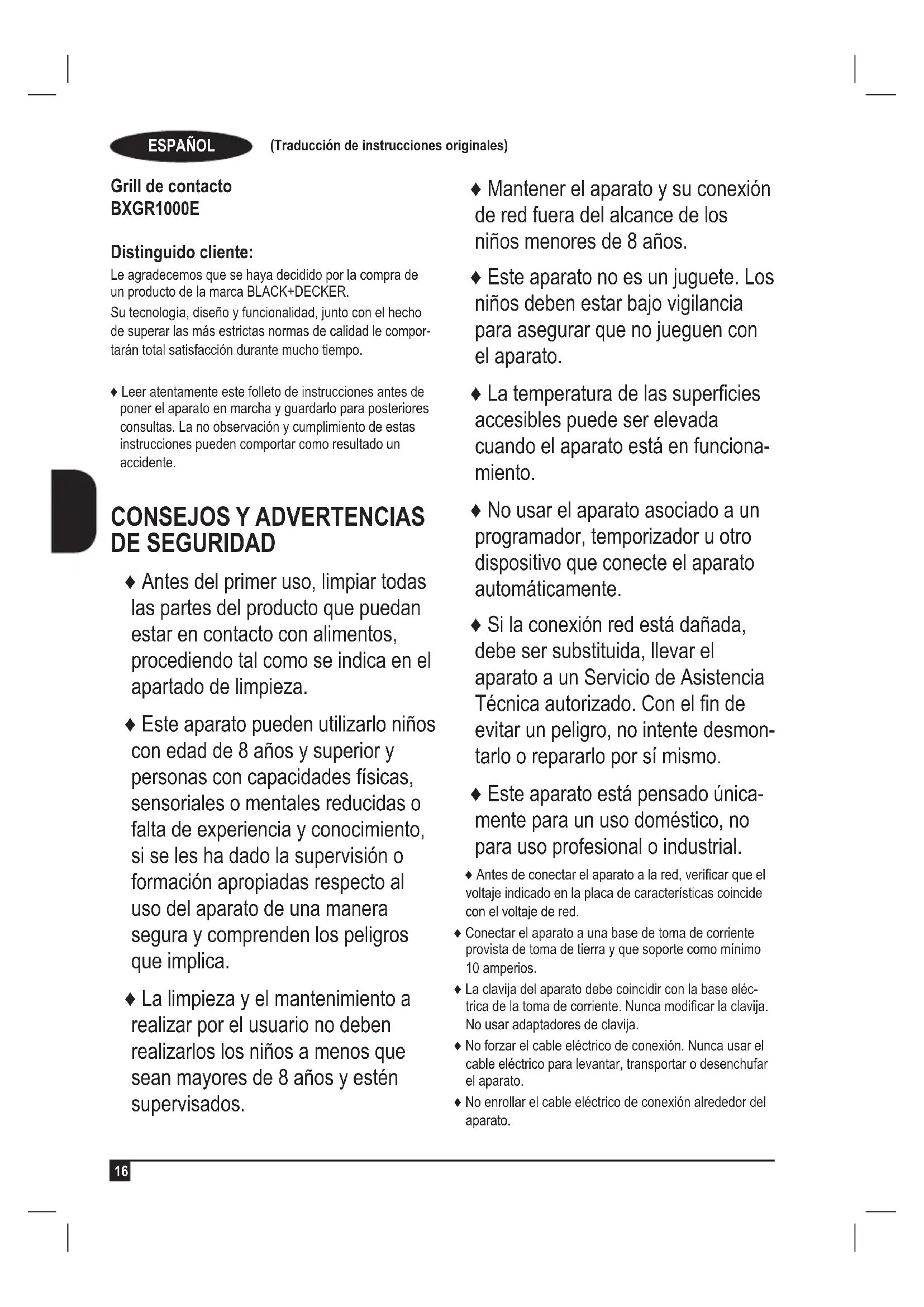 Grill de contacto BXGR1000E Distinguido cliente: Le agradecemos que se haya decidido por la compra de un producto de la marca BLACK+DECKER. Su tecnología, diseño y funcionalidad, junto con el hecho de superar las más estrictas normas de calidad le compor- tarán total satisfacción durante mucho tiempo. ♦ Leer atentamente este folleto de instrucciones antes de poner el aparato en marcha y guardarlo para posteriores consultas. La no observación y cumplimiento de estas instrucciones pueden comportar como resultado un accidente.