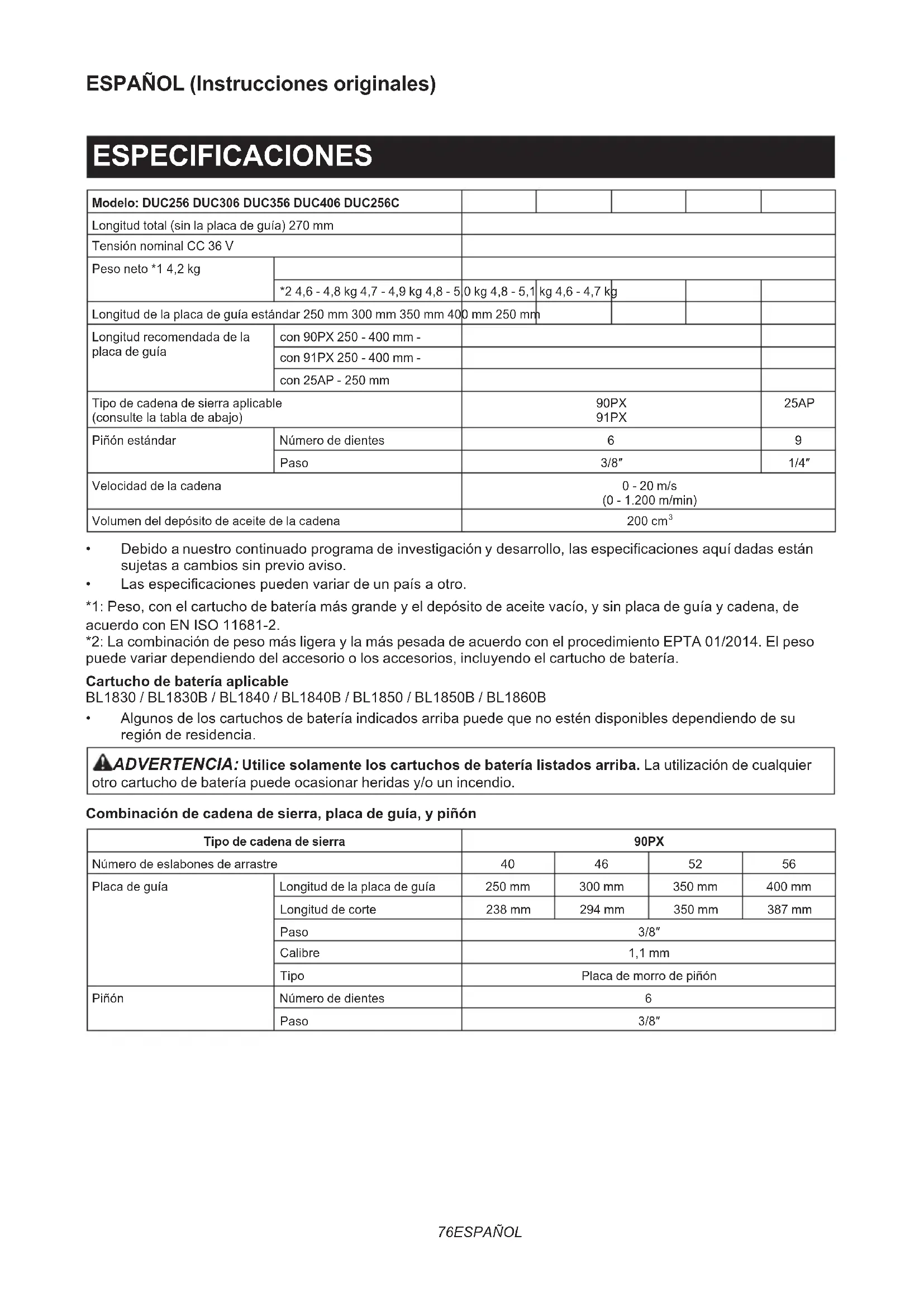 - Batería y cargador genuinos de Makita ADVERTENCIA: Si compra una placa de guía de una longitud diferente de la de la placa de guía estándar, compre también junto con ella una cubierta de la placa de guía apropiada. Esta deberá encajar y cubrir completamente la placa de guía de la electrosierra. NOTA: Algunos elementos de la lista podrán estar incluidos en el paquete de la herramienta como acce- sorios estándar. Pueden variar de un país a otro.90 PORTUGUÊS PORTUGUÊS (Instruções originais) ESPECIFICAÇÕES Modelo: DUC256 DUC306 DUC356 DUC406 DUC256C Comprimento total (sem barra de guia) 270 mm Tensão nominal CC 36 V Peso líquido *1 4,2 kg *2 4,6 - 4,8 kg 4,7 - 4,9 kg 4,8 - 5,0 kg 4,8 - 5,1 kg 4,6 - 4,7 kg Comprimento da barra de guia padrão 250 mm 300 mm 350 mm 400 mm 250 mm Comprimento da barra de guia recomendado com 90PX 250 - 400 mm - com 91PX 250 - 400 mm - com 25AP - 250 mm Tipo de corrente de serra aplicável (consulte a tabela seguinte) 90PX 91PX 25AP Roda de corrente padrão Número de dentes 6 9 Passo 3/8″ 1/4″ Velocidade da corrente 0 - 20 m/s (0 - 1.200 m/min) Volume do depósito de óleo da corrente 200 cm
