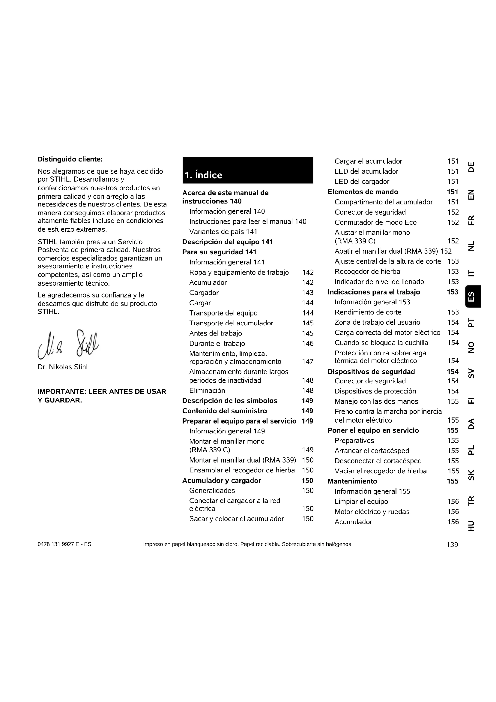 Acerca de este manual de instrucciones 140 Información general 140 Instrucciones para leer el manual 140 Variantes de país 141 Descripción del equipo 141 Para su seguridad 141 Información general 141 Ropa y equipamiento de trabajo 142 Acumulador 142 Cargador 143 Cargar 144 Transporte del equipo 144 Transporte del acumulador 145 Antes del trabajo 145 Durante el trabajo 146 Mantenimiento, limpieza, reparación y almacenamiento 147 Almacenamiento durante largos periodos de inactividad 148 Eliminación 148 Descripción de los símbolos 149 Contenido del suministro 149 Preparar el equipo para el servicio 149 Información general 149 Montar el manillar mono (RMA 339 C) 149 Montar el manillar dual (RMA 339) 150 Ensamblar el recogedor de hierba 150 Acumulador y cargador 150 Generalidades 150 Conectar el cargador a la red eléctrica 150 Sacar y colocar el acumulador 150 Cargar el acumulador 151 LED del acumulador 151 LED del cargador 151 Elementos de mando 151 Compartimento del acumulador 151 Conector de seguridad 152 Conmutador de modo Eco 152 Ajustar el manillar mono (RMA 339 C) 152 Abatir el manillar dual (RMA 339) 152 Ajuste central de la altura de corte 153 Recogedor de hierba 153 Indicador de nivel de llenado 153 Indicaciones para el trabajo 153 Información general 153 Rendimiento de corte 153 Zona de trabajo del usuario 154 Carga correcta del motor eléctrico 154 Cuando se bloquea la cuchilla 154 Protección contra sobrecarga térmica del motor eléctrico 154 Dispositivos de seguridad 154 Conector de seguridad 154 Dispositivos de protección 154 Manejo con las dos manos 155 Freno contra la marcha por inercia del motor eléctrico 155 Poner el equipo en servicio 155 Preparativos 155 Arrancar el cortacésped 155 Desconectar el cortacésped 155 Vaciar el recogedor de hierba 155 Mantenimiento 155 Información general 155 Limpiar el equipo 156 Motor eléctrico y ruedas 156 Acumulador 1560478 131 9927 E - ES