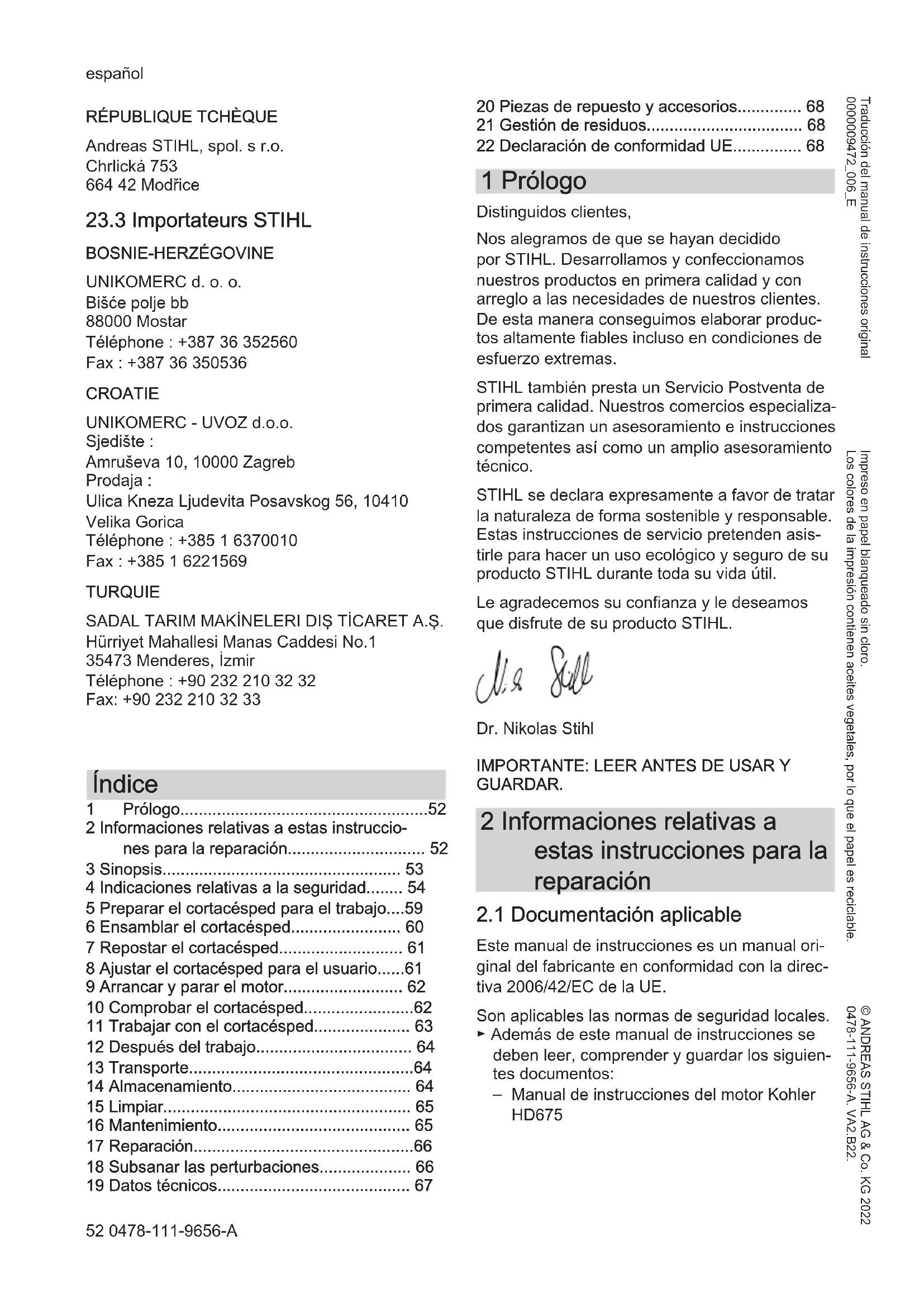 - 22 Declaración de conformidad UE 1 Prólogo Distinguidos clientes, Nos alegramos de que se hayan decidido por STIHL. Desarrollamos y confeccionamos nuestros productos en primera calidad y con arreglo a las necesidades de nuestros clientes. De esta manera conseguimos elaborar produc‐ tos altamente fiables incluso en condiciones de esfuerzo extremas. STIHL también presta un Servicio Postventa de primera calidad. Nuestros comercios especializa‐ dos garantizan un asesoramiento e instrucciones competentes así como un amplio asesoramiento técnico. STIHL se declara expresamente a favor de tratar la naturaleza de forma sostenible y responsable. Estas instrucciones de servicio pretenden asis‐ tirle para hacer un uso ecológico y seguro de su producto STIHL durante toda su vida útil. Le agradecemos su confianza y le deseamos que disfrute de su producto STIHL. Dr. Nikolas Stihl p. 68