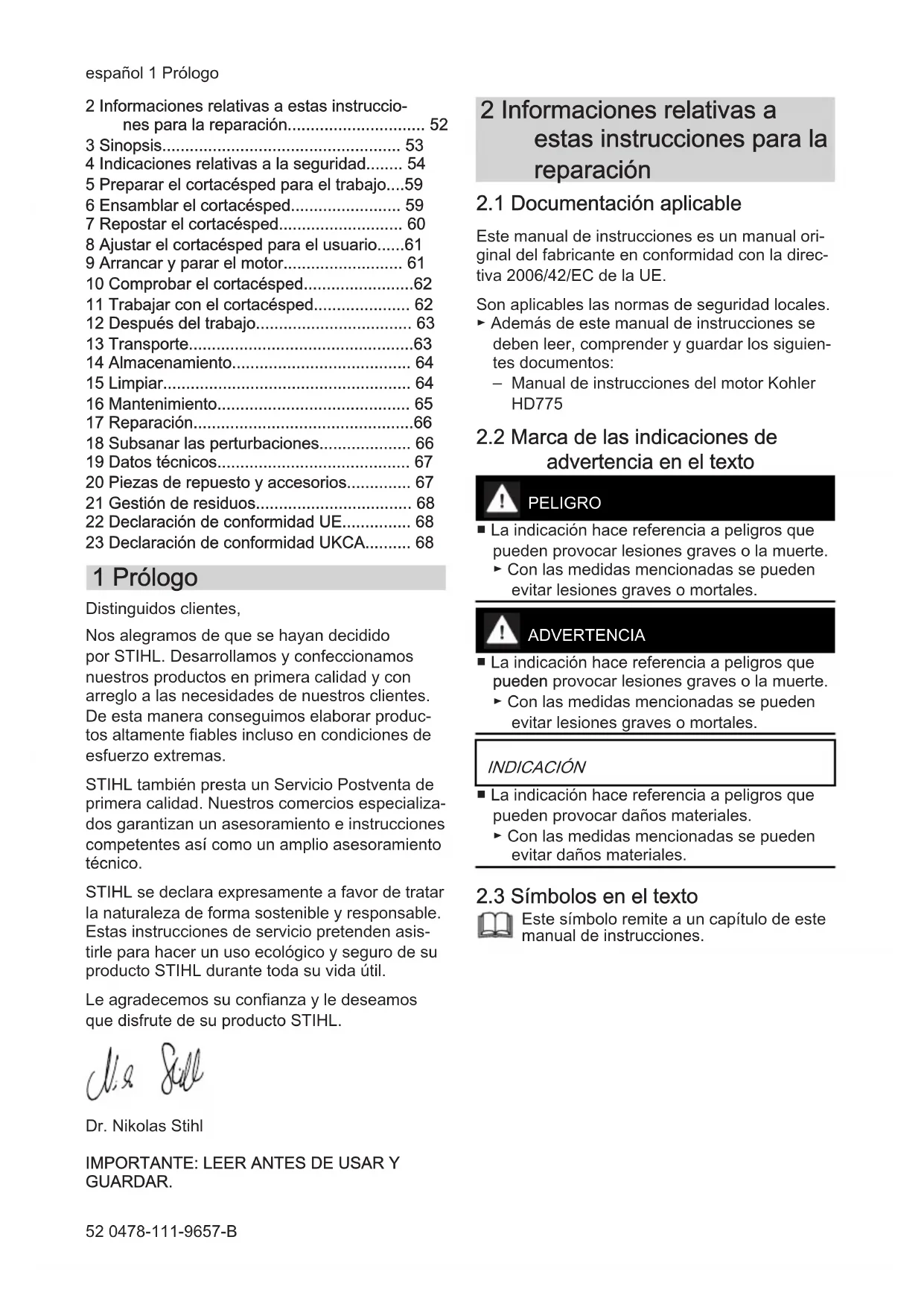 - 23 Declaración de conformidad UKCA 1 Prólogo Distinguidos clientes, Nos alegramos de que se hayan decidido por STIHL. Desarrollamos y confeccionamos nuestros productos en primera calidad y con arreglo a las necesidades de nuestros clientes. De esta manera conseguimos elaborar produc‐ tos altamente fiables incluso en condiciones de esfuerzo extremas. STIHL también presta un Servicio Postventa de primera calidad. Nuestros comercios especializa‐ dos garantizan un asesoramiento e instrucciones competentes así como un amplio asesoramiento técnico. STIHL se declara expresamente a favor de tratar la naturaleza de forma sostenible y responsable. Estas instrucciones de servicio pretenden asis‐ tirle para hacer un uso ecológico y seguro de su producto STIHL durante toda su vida útil. Le agradecemos su confianza y le deseamos que disfrute de su producto STIHL. Dr. Nikolas Stihl p. 68