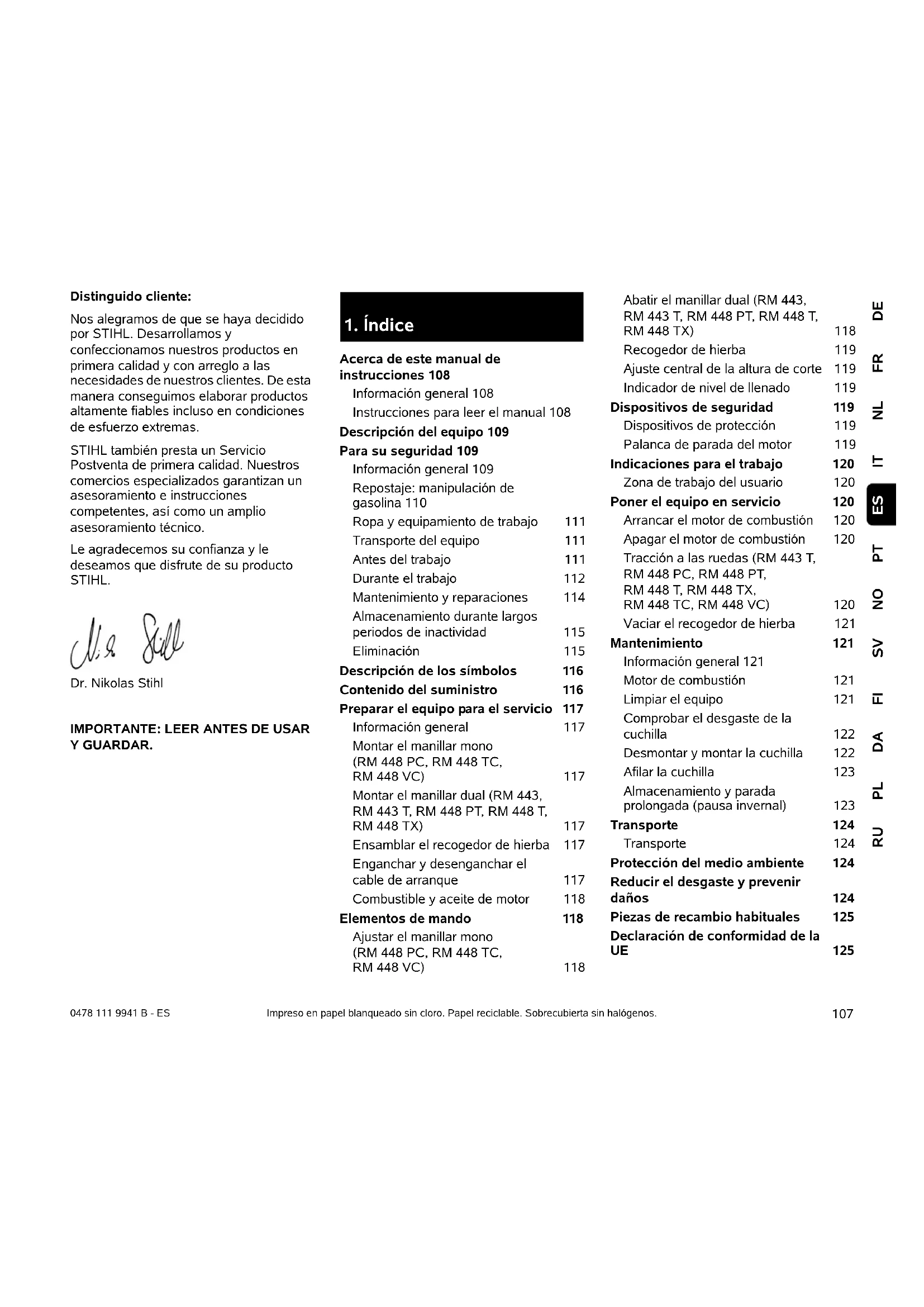 Acerca de este manual de instrucciones 108 Información general 108 Instrucciones para leer el manual 108 Descripción del equipo 109 Para su seguridad 109 Información general 109 Repostaje: manipulación de gasolina 110 Ropa y equipamiento de trabajo 111 Transporte del equipo 111 Antes del trabajo 111 Durante el trabajo 112 Mantenimiento y reparaciones 114 Almacenamiento durante largos periodos de inactividad 115 Eliminación 115 Descripción de los símbolos 116 Contenido del suministro 116 Preparar el equipo para el servicio 117 Información general 117 Montar el manillar mono (RM 448 PC, RM 448 TC, RM 448 VC) 117 Montar el manillar dual (RM 443, RM 443 T, RM 448 PT, RM 448 T, RM 448 TX) 117 Ensamblar el recogedor de hierba 117 Enganchar y desenganchar el cable de arranque 117 Combustible y aceite de motor 118 Elementos de mando 118 Ajustar el manillar mono (RM 448 PC, RM 448 TC, RM 448 VC) 118 Abatir el manillar dual (RM 443, RM443T, RM448PT, RM448T, RM 448 TX) 118 Recogedor de hierba 119 Ajuste central de la altura de corte 119 Indicador de nivel de llenado 119 Dispositivos de seguridad 119 Dispositivos de protección 119 Palanca de parada del motor 119 Indicaciones para el trabajo 120 Zona de trabajo del usuario 120 Poner el equipo en servicio 120 Arrancar el motor de combustión 120 Apagar el motor de combustión 120 Tracción a las ruedas (RM 443 T, RM 448 PC, RM 448 PT, RM 448 T, RM 448 TX, RM 448 TC, RM 448 VC) 120 Vaciar el recogedor de hierba 121 Mantenimiento 121 Información general 121 Motor de combustión 121 Limpiar el equipo 121 Comprobar el desgaste de la cuchilla 122 Desmontar y montar la cuchilla 122 Afilar la cuchilla 123 Almacenamiento y parada prolongada (pausa invernal) 123 Transporte 124 Transporte 124 Protección del medio ambiente 124 Reducir el desgaste y prevenir daños 124 Piezas de recambio habituales 125 Declaración de conformidad de la UE 1250478 111 9941 B - ES