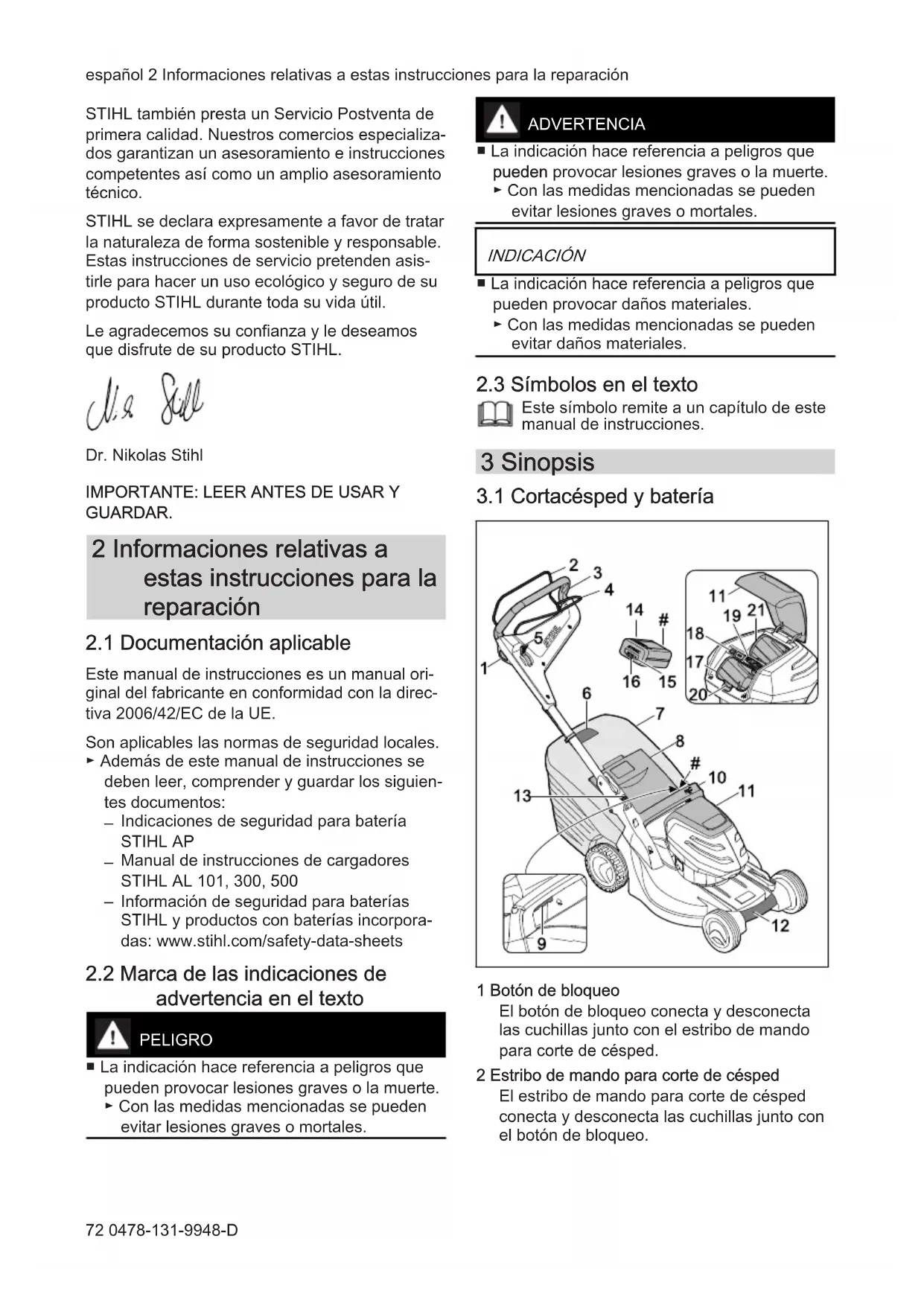 - 26 Indicaciones técnicas de seguridad para cortacéspedes 1 Prólogo Distinguidos clientes, Nos alegramos de que se hayan decidido por STIHL. Desarrollamos y confeccionamos nuestros productos en primera calidad y con arreglo a las necesidades de nuestros clientes. De esta manera conseguimos elaborar produc‐ tos altamente fiables incluso en condiciones de esfuerzo extremas. español 0478-131-9948-D 71 © ANDREAS STIHL AG & Co. KG 2021 0478-131-9948-D. VA1.L21. Impreso en papel blanqueado sin cloro. Los colores de la impresión contienen aceites vegetales, por lo que el papel es reciclable. Traducción del manual de instrucciones original 0000009303_005_ESTIHL también presta un Servicio Postventa de primera calidad. Nuestros comercios especializa‐ dos garantizan un asesoramiento e instrucciones competentes así como un amplio asesoramiento técnico. STIHL se declara expresamente a favor de tratar la naturaleza de forma sostenible y responsable. Estas instrucciones de servicio pretenden asis‐ tirle para hacer un uso ecológico y seguro de su producto STIHL durante toda su vida útil. Le agradecemos su confianza y le deseamos que disfrute de su producto STIHL. Dr. Nikolas Stihl p. 93