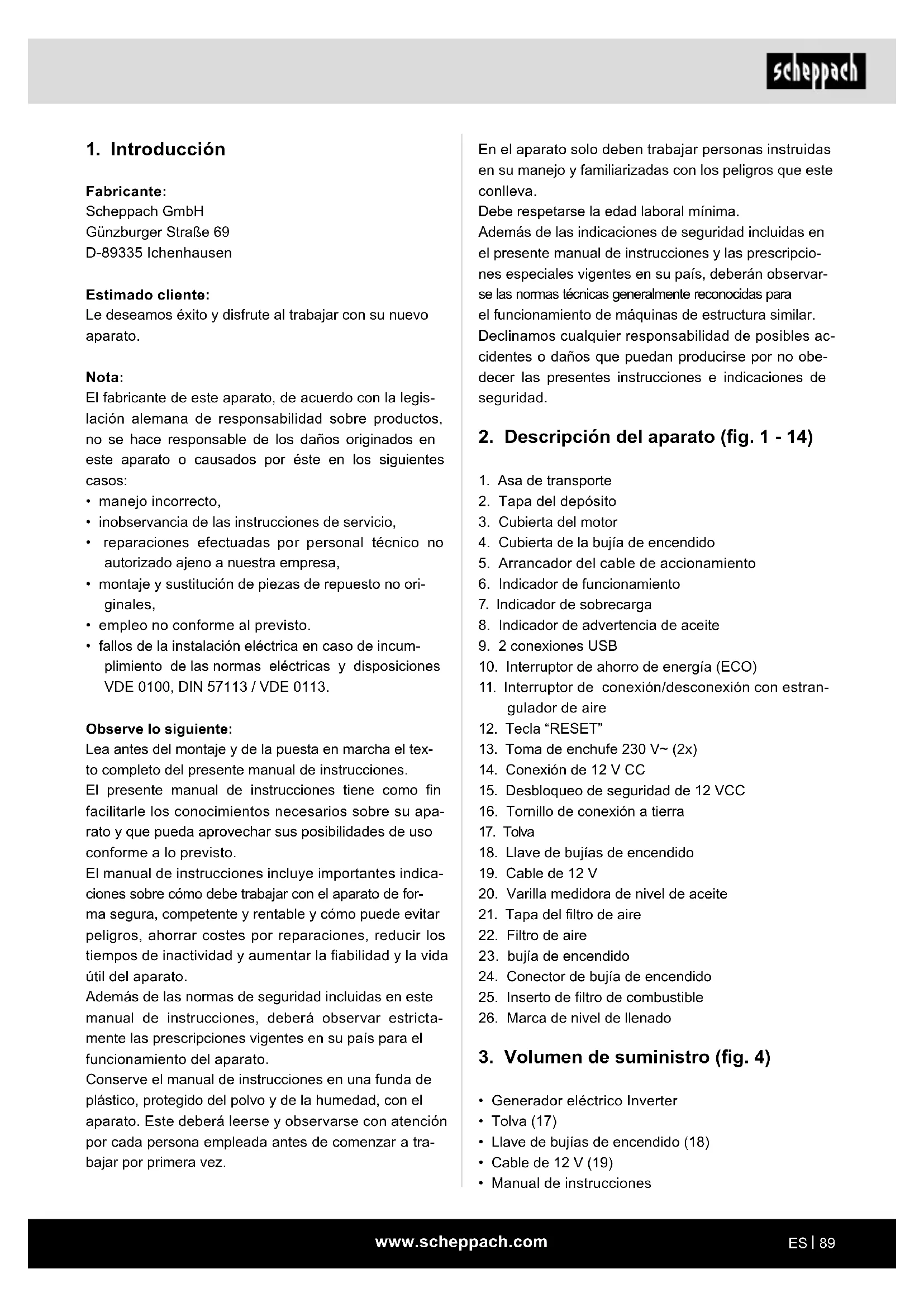 - fallos de la instalación eléctrica en caso de incum- plimiento de las normas eléctricas y disposiciones VDE 0100, DIN 57113 / VDE 0113. Observe lo siguiente: Lea antes del montaje y de la puesta en marcha el tex- to completo del presente manual de instrucciones. El presente manual de instrucciones tiene como n facilitarle los conocimientos necesarios sobre su apa- rato y que pueda aprovechar sus posibilidades de uso conforme a lo previsto. El manual de instrucciones incluye importantes indica- ciones sobre cómo debe trabajar con el aparato de for- ma segura, competente y rentable y cómo puede evitar peligros, ahorrar costes por reparaciones, reducir los tiempos de inactividad y aumentar la abilidad y la vida útil del aparato. Además de las normas de seguridad incluidas en este manual de instrucciones, deberá observar estricta- mente las prescripciones vigentes en su país para el funcionamiento del aparato. Conserve el manual de instrucciones en una funda de plástico, protegido del polvo y de la humedad, con el aparato. Este deberá leerse y observarse con atención por cada persona empleada antes de comenzar a tra- bajar por primera vez.www.scheppach.com