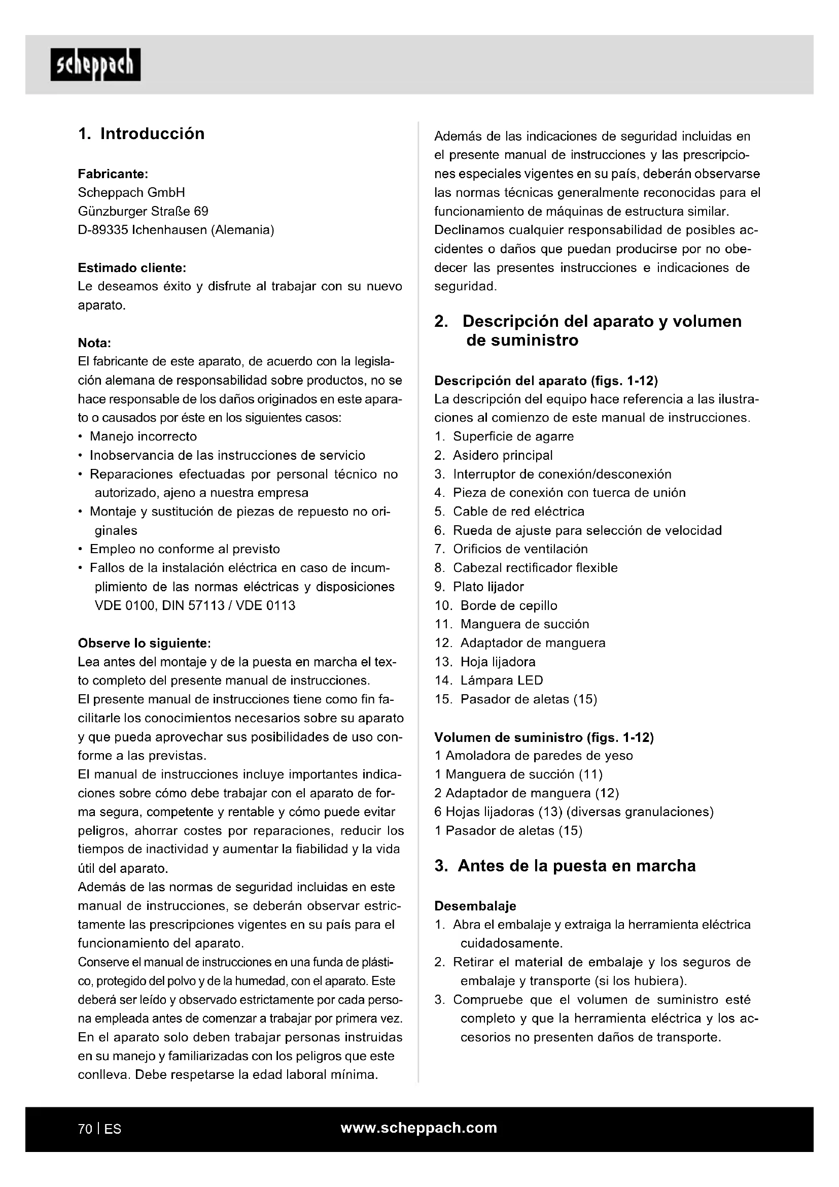 Fabricante: Scheppach GmbH Günzburger Straße 69 D-89335 Ichenhausen (Alemania) Estimado cliente: Le deseamos éxito y disfrute al trabajar con su nuevo aparato. Nota: El fabricante de este aparato, de acuerdo con la legisla- ción alemana de responsabilidad sobre productos, no se hace responsable de los daños originados en este apara- to o causados por éste en los siguientes casos: