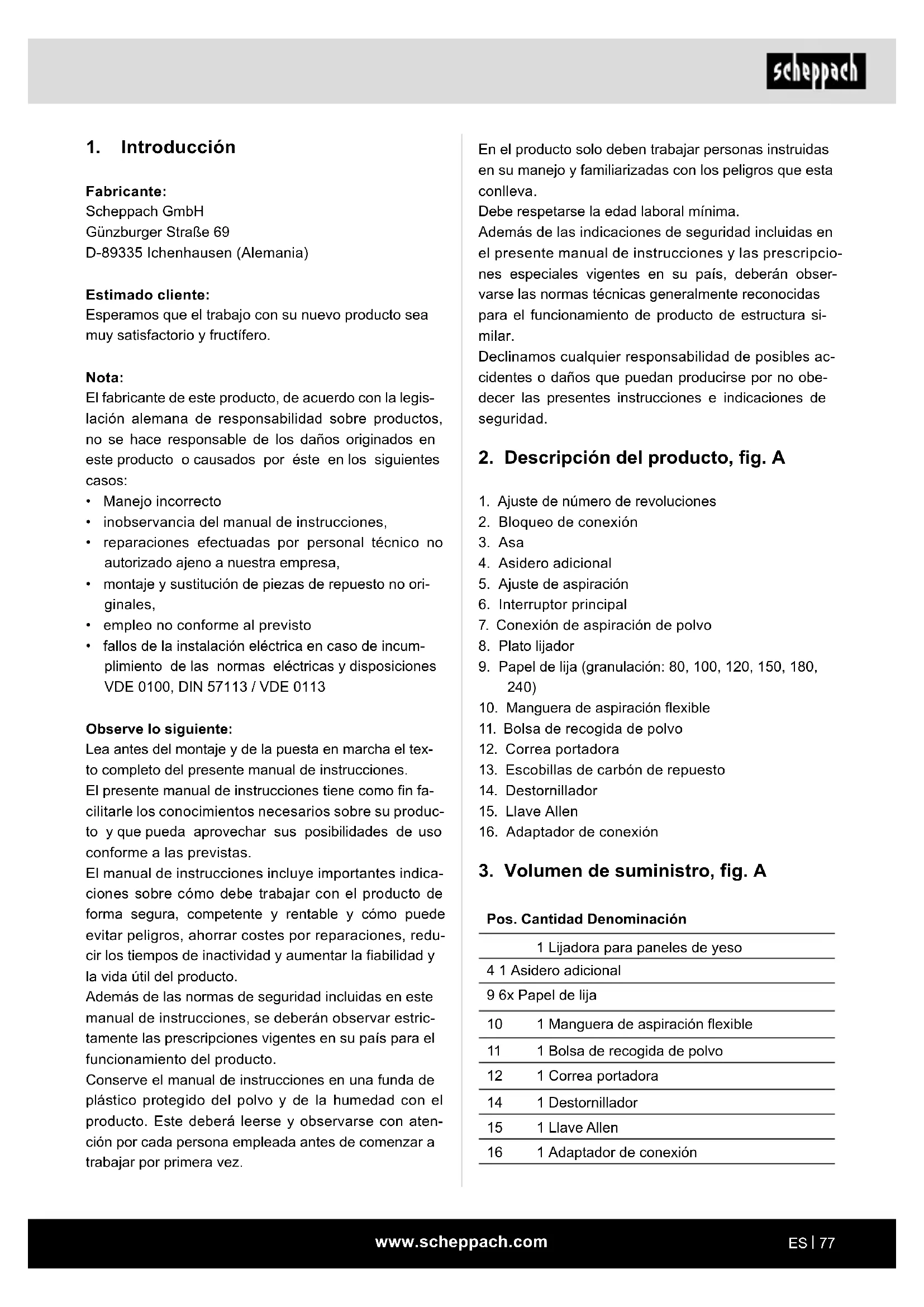 El uso previsto de este producto incluye el lijado en seco de gran supercie de paneles de yeso como pre- paración para pintar o empapelar utilizando hojas lija- doras adecuadas. Este producto no es adecuado para el procesamien- to de zonas pequeñas, esquinas y bordes. Tampoco resulta adecuada para lijar papel pintado, y no debe utilizarse para lijar en húmedo. El producto no debe utilizarse como muela tronzado- ra o desbastadora, pulidora ni con cepillos metálicos. Con este producto no pueden procesarse materiales que contengan amianto. El producto solo debe utilizarse para el uso previsto. Se considerará inapropiado cualquier uso que vaya más allá. Los daños o lesiones de cualquier tipo produ- cidos a consecuencia de lo anterior serán responsabi- lidad del usuario/operario, no del fabricante. El cumplimiento de las indicaciones de seguridad tam- bién forma parte del uso conforme al previsto, al igual que el manual de montaje y las instrucciones de fun- cionamiento en el manual de instrucciones. Las personas que se ocupen del manejo y uso del producto, deben estar familiarizadas con el mismo e informados sobre los posibles peligros. Asimismo, también deben cumplirse de manera estric- ta las normas vigentes en prevención de accidentes. También deben cumplirse las normas generales en materia de sanidad laboral y de técnicas de seguridad. Si el usuario hiciera modicaciones en el producto, el fabricante no se responsabilizará de ningún daño que ello pueda causar. El producto debe usarse únicamente con piezas y ac- cesorios originales del fabricante. Deben observarse las prescripciones de seguridad, trabajo y mantenimiento del fabricante, así como las dimensiones indicadas en los Datos técnicos. Recuerde que nuestros productos no están diseñados para usos comerciales, artesanales ni industriales. No concedemos ningún tipo de garantía si se utiliza el pro- ducto en empresas comerciales, artesanales o indus- triales, ni en actividades de características similares.www.scheppach.com