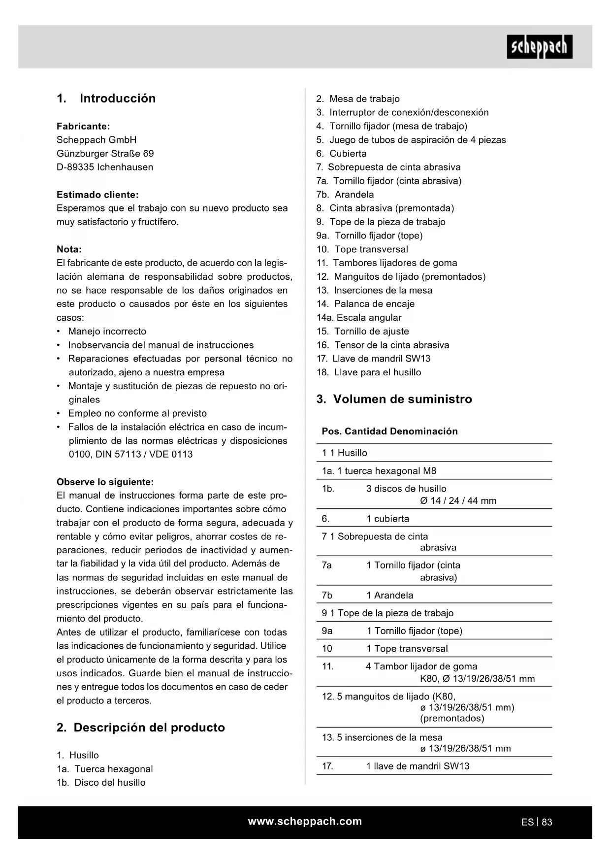 Fabricante: Scheppach GmbH Günzburger Straße 69 D-89335 Ichenhausen Estimado cliente: Esperamos que el trabajo con su nuevo producto sea muy satisfactorio y fructífero. Nota: El fabricante de este producto, de acuerdo con la legis- lación alemana de responsabilidad sobre productos, no se hace responsable de los daños originados en este producto o causados por éste en los siguientes casos: