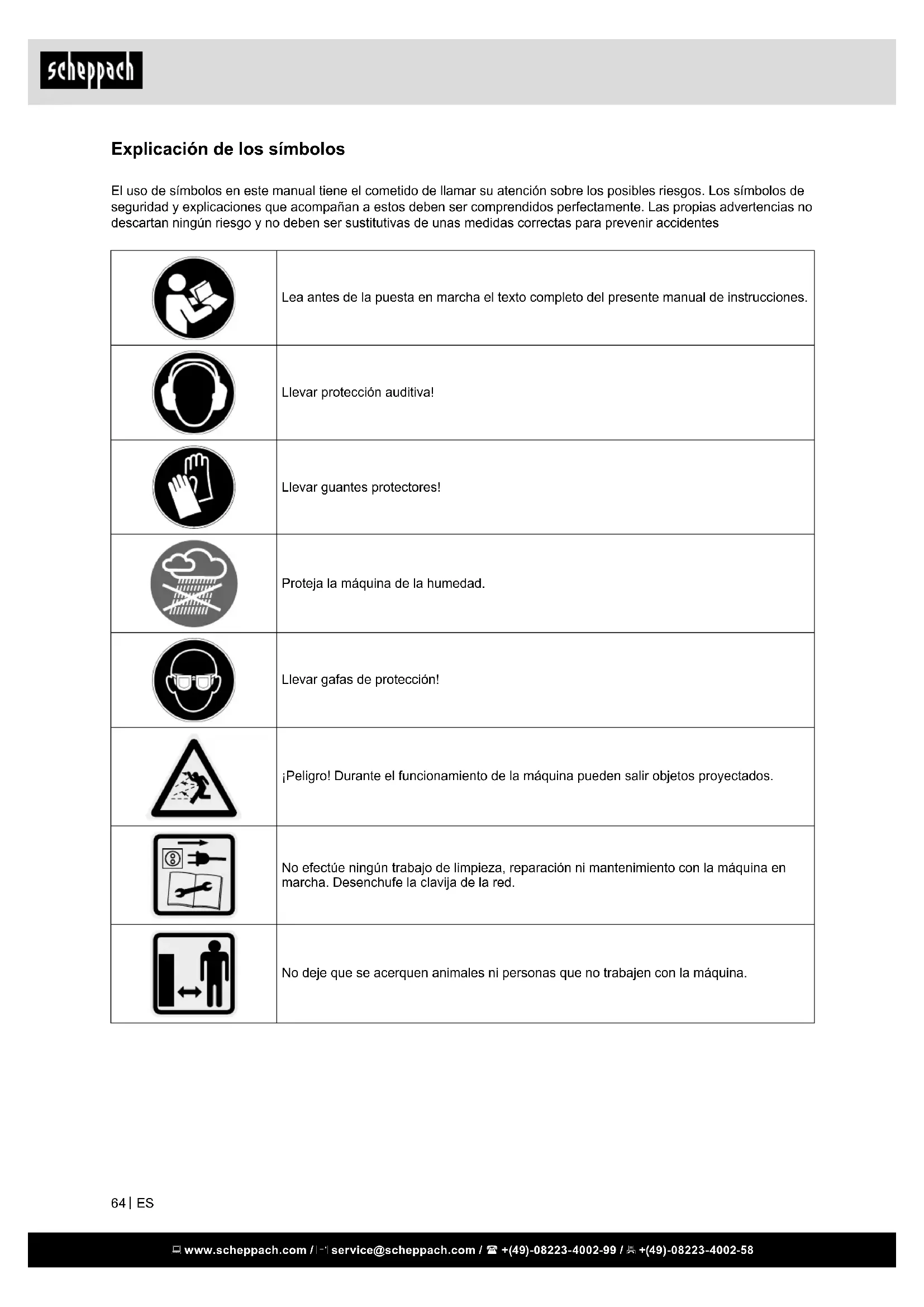 ES¡Atención! ¡Peligro de lesiones por el cilindro de cuchillas en rotación! No introduzca las manos ni los pies en las aberturas cuando la máquina está en marcha. No utilizar como escalón o peldaño. m ¡Atención! En estas instrucciones de servicio hemos marcado con el siguiente signo aquellos pun- tos que afectan a su seguridad. www.scheppach.com / service@scheppach.com / +(49)-08223-4002-99 / +(49)-08223-4002-58