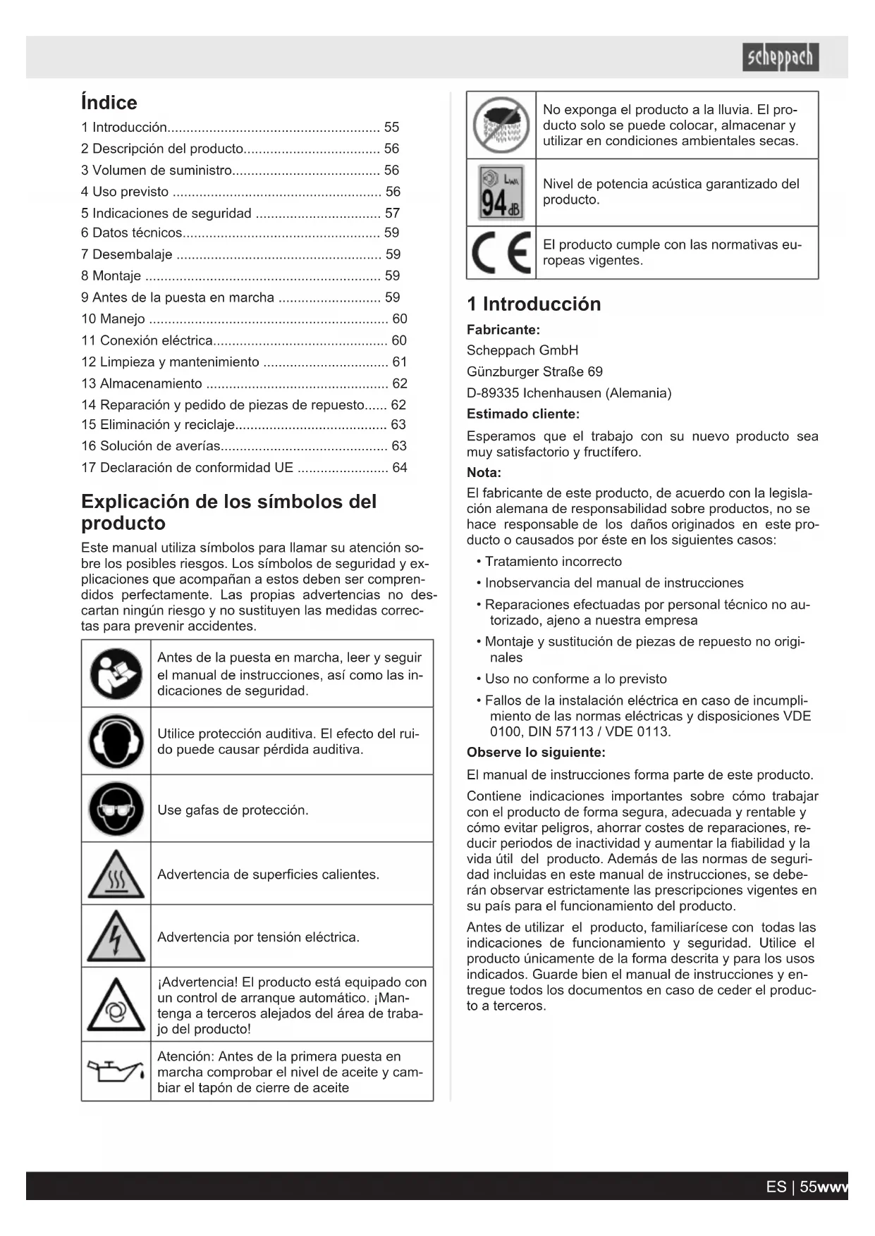 - 17 Declaración de conformidad UE Explicación de los símbolos del producto Este manual utiliza símbolos para llamar su atención so- bre los posibles riesgos. Los símbolos de seguridad y ex- plicaciones que acompañan a estos deben ser compren- didos perfectamente. Las propias advertencias no des- cartan ningún riesgo y no sustituyen las medidas correc- tas para prevenir accidentes. Antes de la puesta en marcha, leer y seguir el manual de instrucciones, así como las in- dicaciones de seguridad. Utilice protección auditiva. El efecto del rui- do puede causar pérdida auditiva. Use gafas de protección. Advertencia de superficies calientes. Advertencia por tensión eléctrica. ¡Advertencia! El producto está equipado con un control de arranque automático. ¡Man- tenga a terceros alejados del área de traba- jo del producto! Atención: Antes de la primera puesta en marcha comprobar el nivel de aceite y cam- biar el tapón de cierre de aceite No exponga el producto a la lluvia. El pro- ducto solo se puede colocar, almacenar y utilizar en condiciones ambientales secas. Nivel de potencia acústica garantizado del producto. El producto cumple con las normativas eu- ropeas vigentes. 1 Introducción Fabricante: Scheppach GmbH Günzburger Straße 69 D-89335 Ichenhausen (Alemania) Estimado cliente: Esperamos que el trabajo con su nuevo producto sea muy satisfactorio y fructífero. Nota: El fabricante de este producto, de acuerdo con la legisla- ción alemana de responsabilidad sobre productos, no se hace responsable de los daños originados en este pro- ducto o causados por éste en los siguientes casos: p. 64