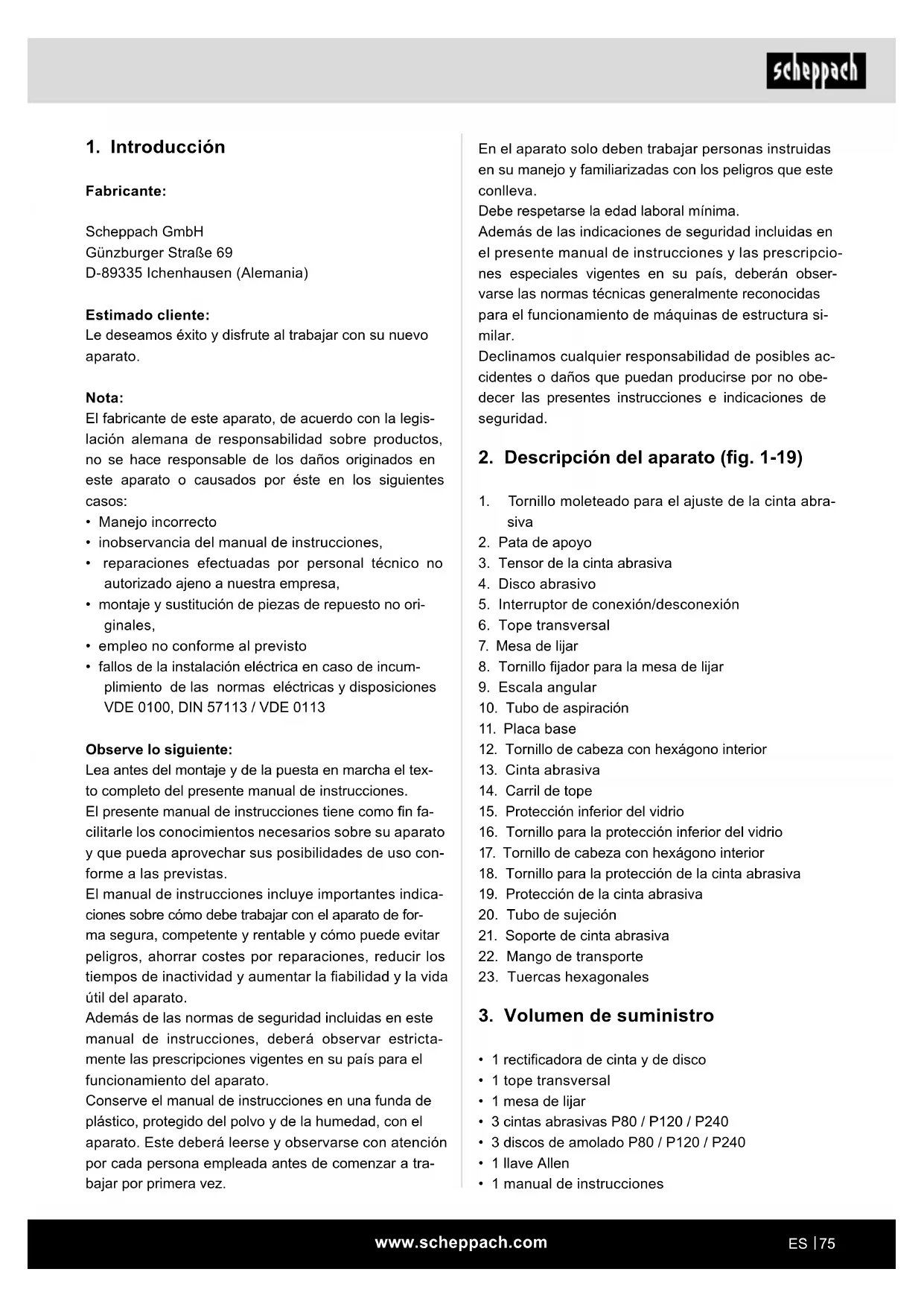 Observe lo siguiente: Lea antes del montaje y de la puesta en marcha el tex- to completo del presente manual de instrucciones. El presente manual de instrucciones tiene como n fa- cilitarle los conocimientos necesarios sobre su aparato y que pueda aprovechar sus posibilidades de uso con- forme a las previstas. El manual de instrucciones incluye importantes indica- ciones sobre cómo debe trabajar con el aparato de for- ma segura, competente y rentable y cómo puede evitar peligros, ahorrar costes por reparaciones, reducir los tiempos de inactividad y aumentar la abilidad y la vida útil del aparato. Además de las normas de seguridad incluidas en este manual de instrucciones, deberá observar estricta- mente las prescripciones vigentes en su país para el funcionamiento del aparato. Conserve el manual de instrucciones en una funda de plástico, protegido del polvo y de la humedad, con el aparato. Este deberá leerse y observarse con atención por cada persona empleada antes de comenzar a tra- bajar por primera vez.www.scheppach.com