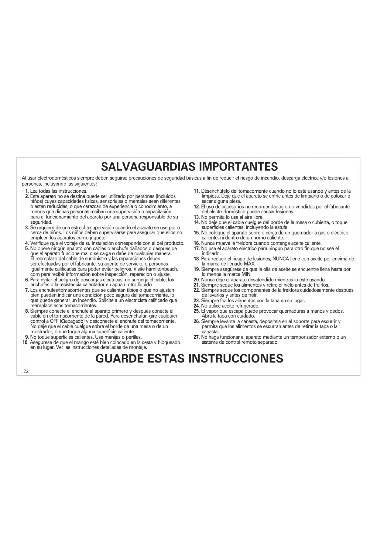 Descarga las instrucciones para tu Freidora en formato PDF gratis! Encuentra tus instrucciones 35335 - HAMILTON BEACH y toma tu dispositivo electrónico nuevamente en la mano. En esta página están publicados todos los documentos necesarios para el uso de su dispositivo. 35335 de la marca HAMILTON BEACH.